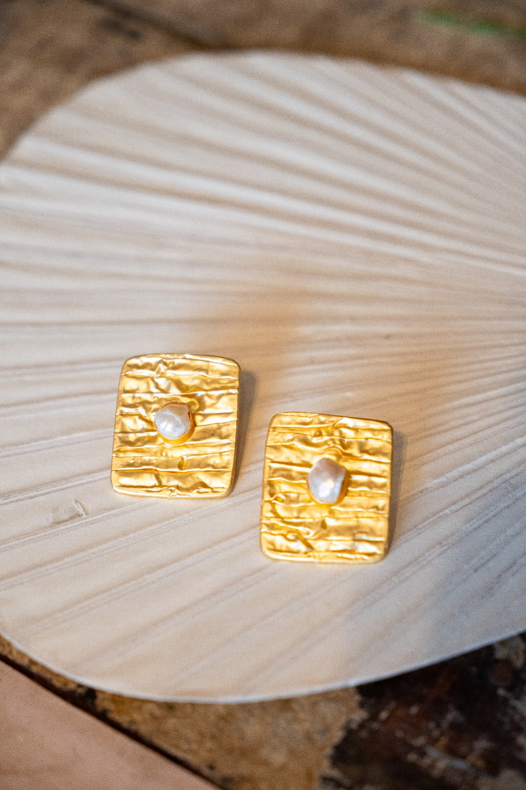 Square earrings stand out for their relief and a stone in the center. The pearl varies from the one in the photo due to its nature.