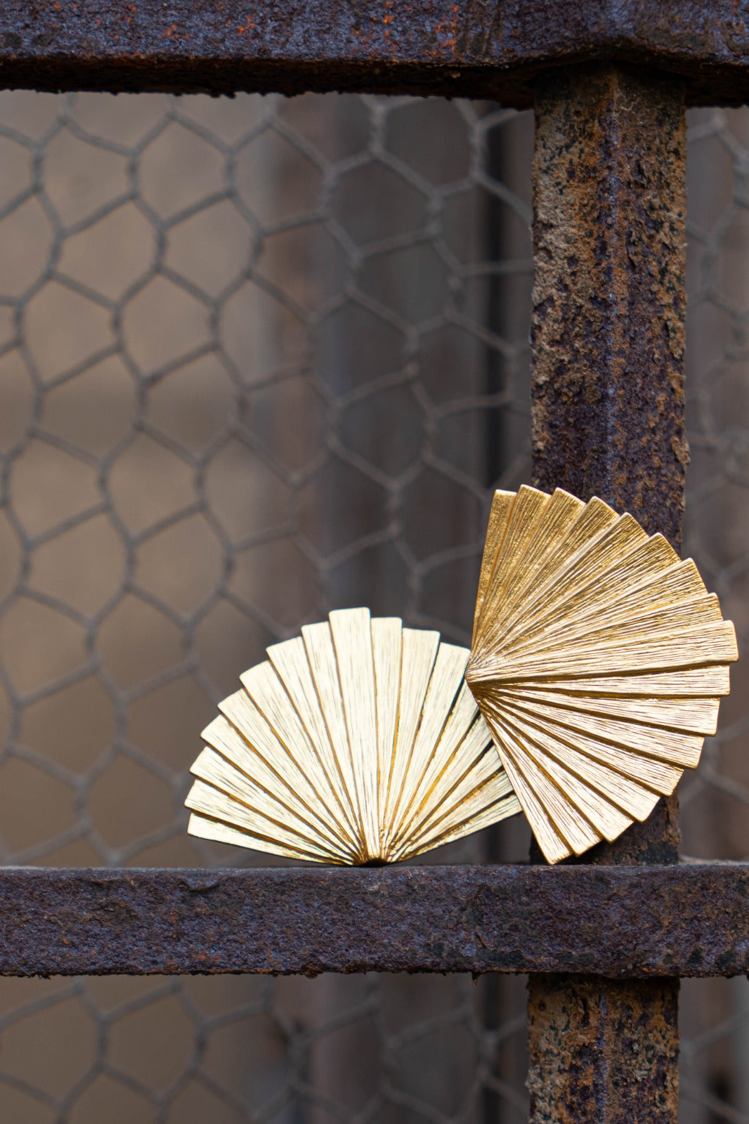 Fan-shaped earrings with snap closure.
