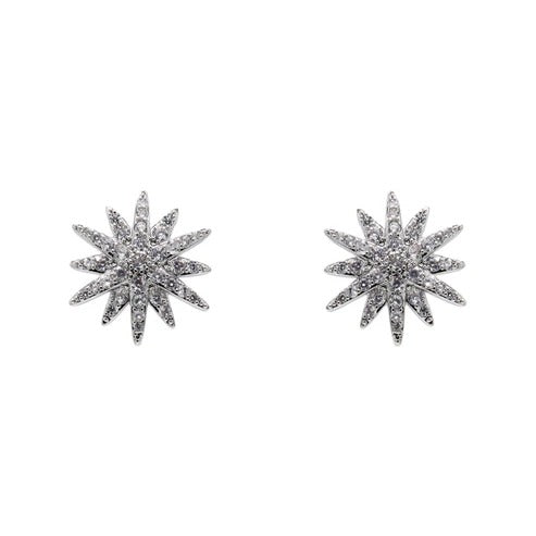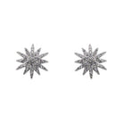 Star-shaped stud earrings with a silver-plated base, decorated with small cubic zirconia stones. Some cubic zirconia stones are darker than others. Screw-back closure.