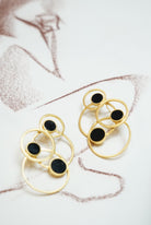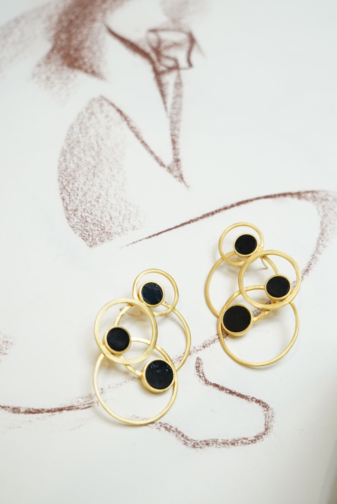 Gold earrings made up of several circles, with black circle detail. Handcrafted earrings.