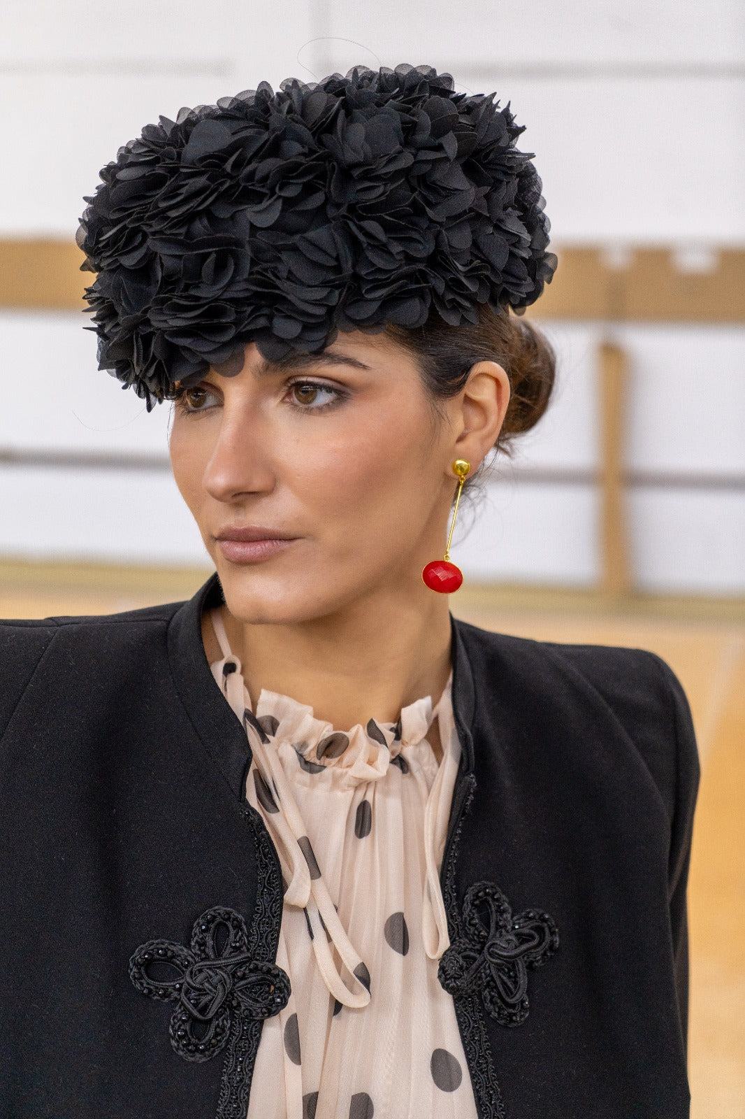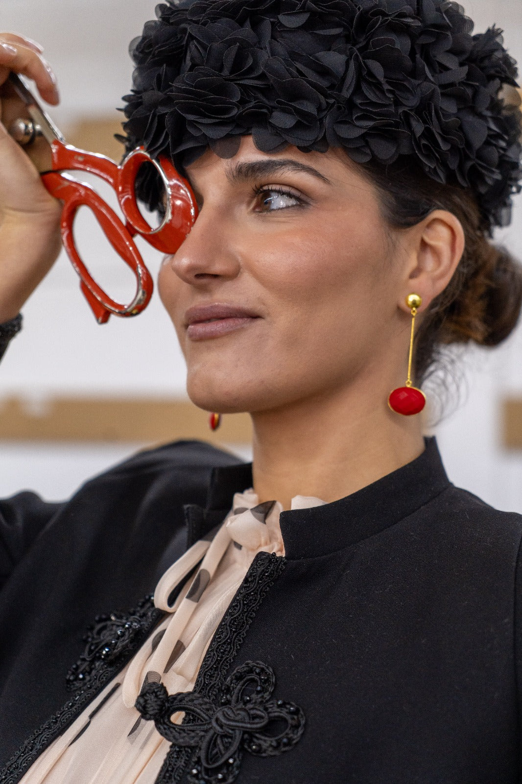 Earrings with a vertical post that delicately holds a red stone, with a nut closure.