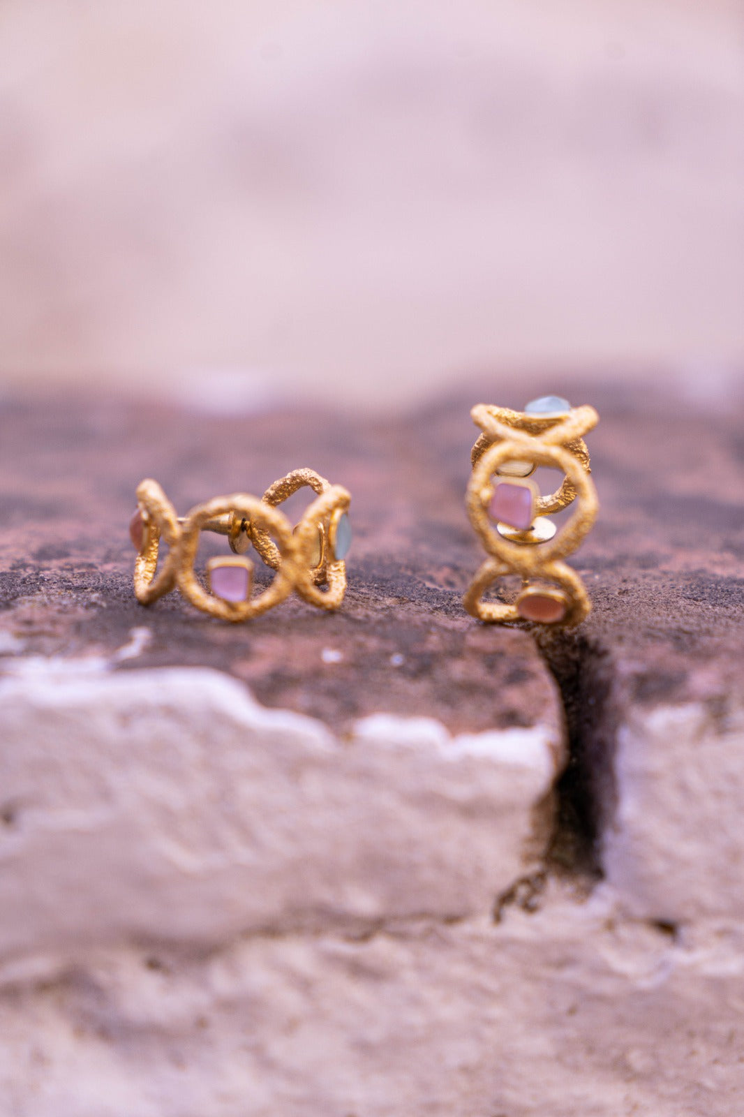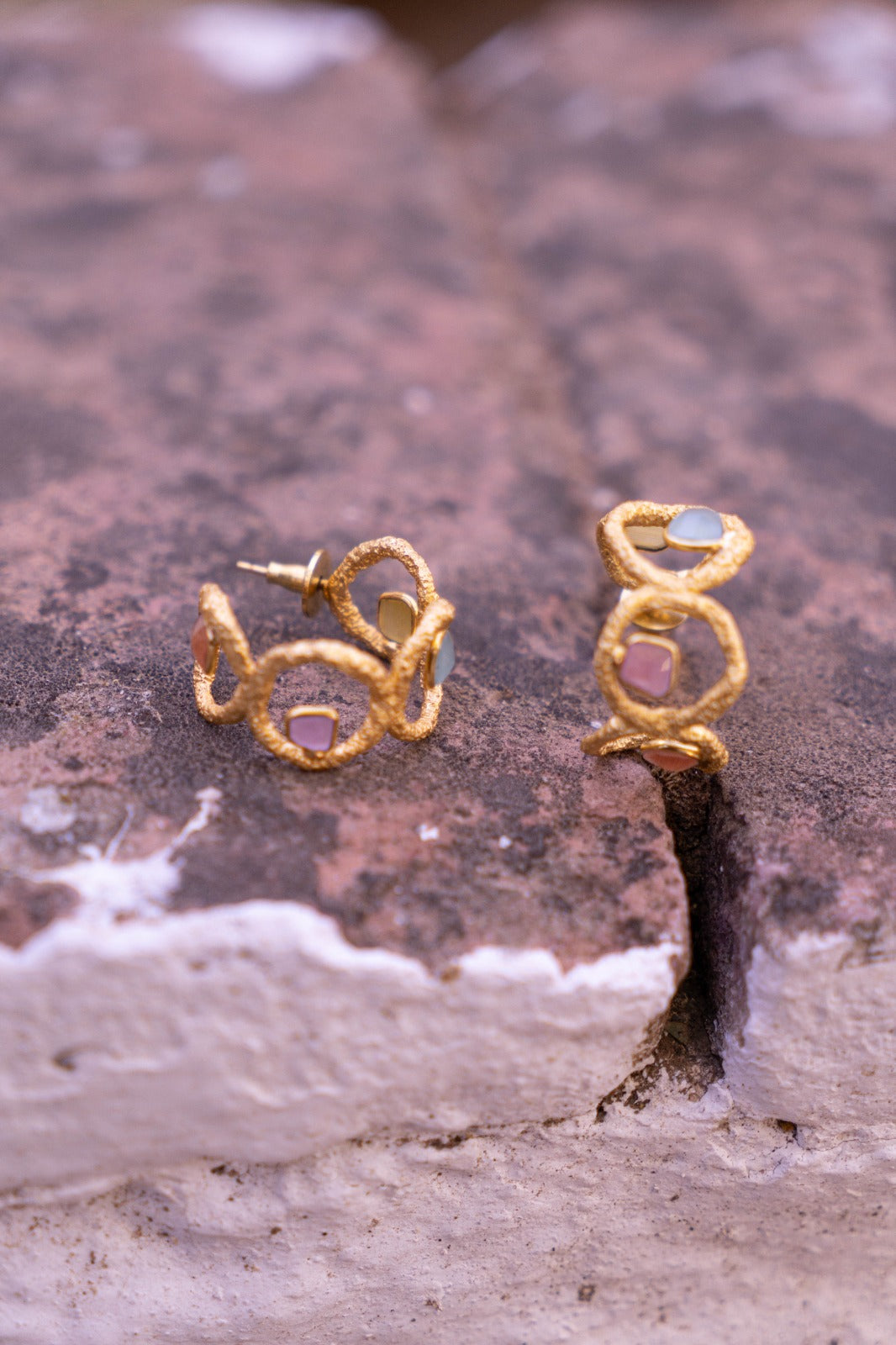 Earrings in the shape of several circles joined together to create a hoop. Inside each of them is a stone of a different color.