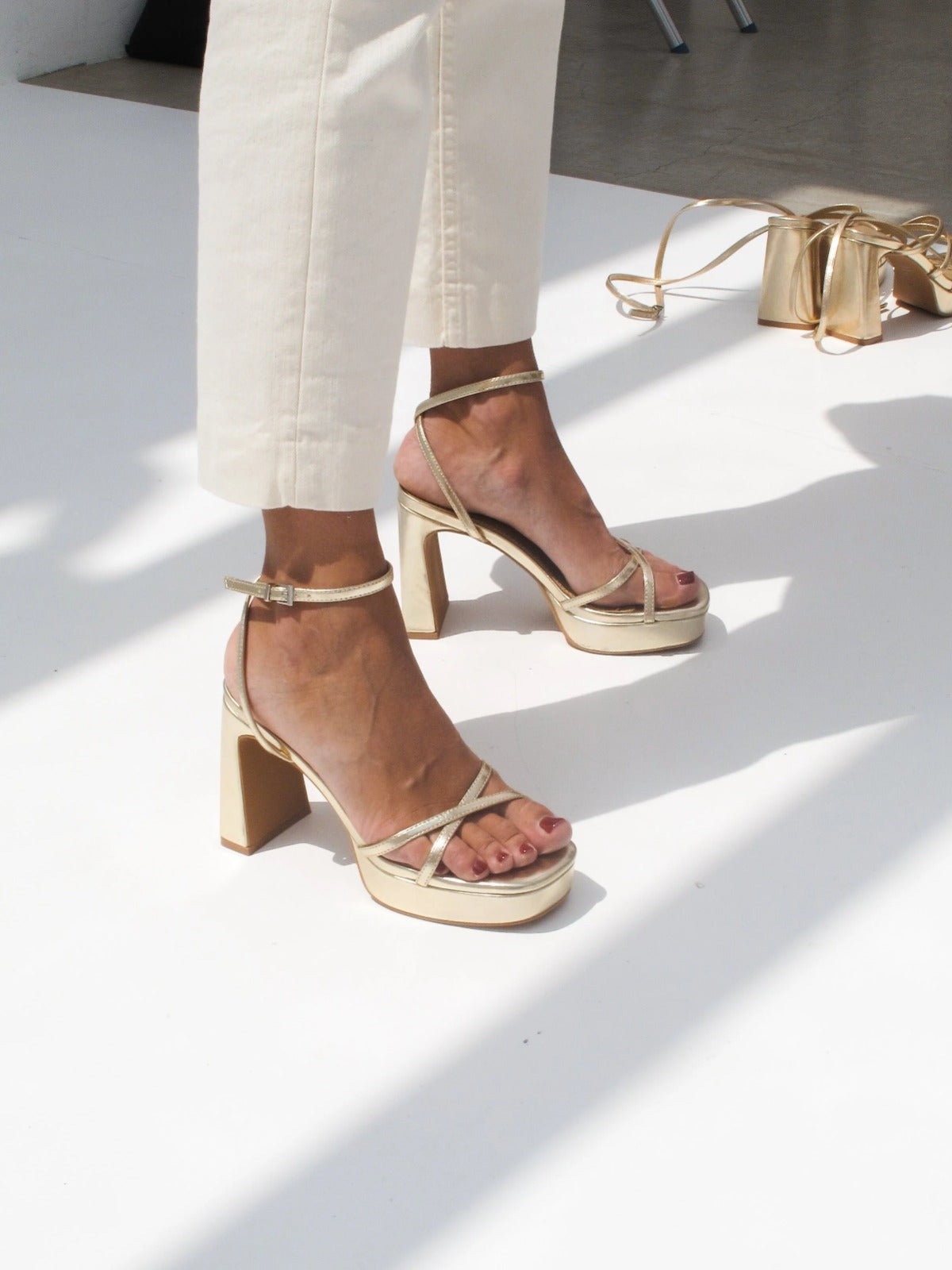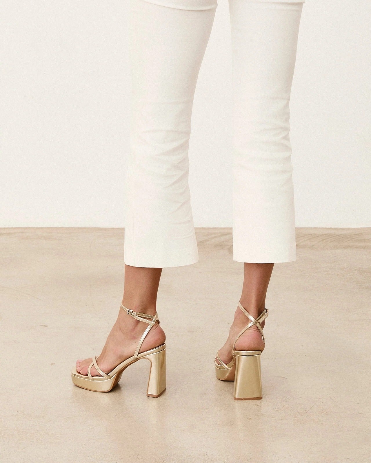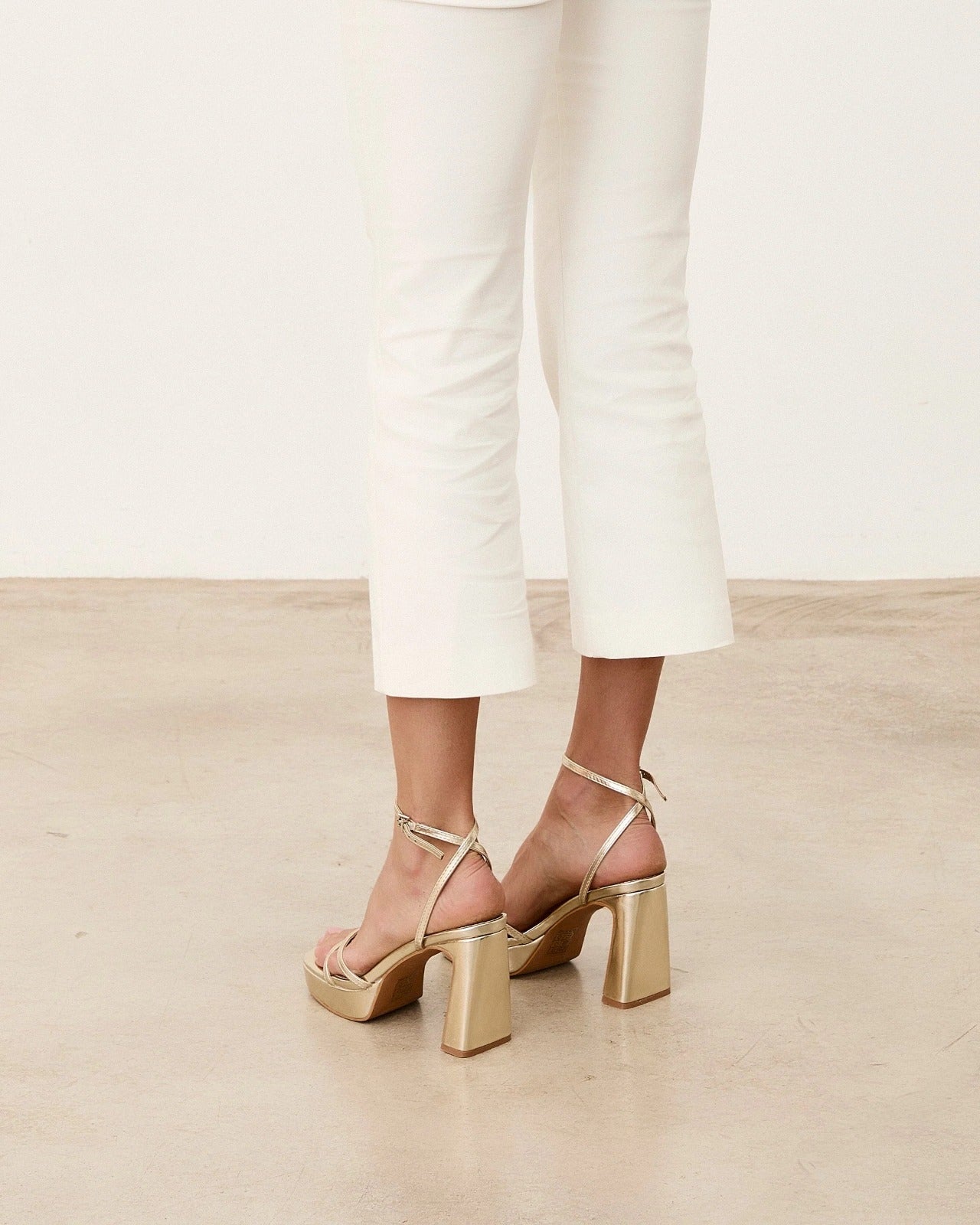 Sandalia de tacón con plataforma color dorado con tiras. Cierre en el tobillo con hebilla.