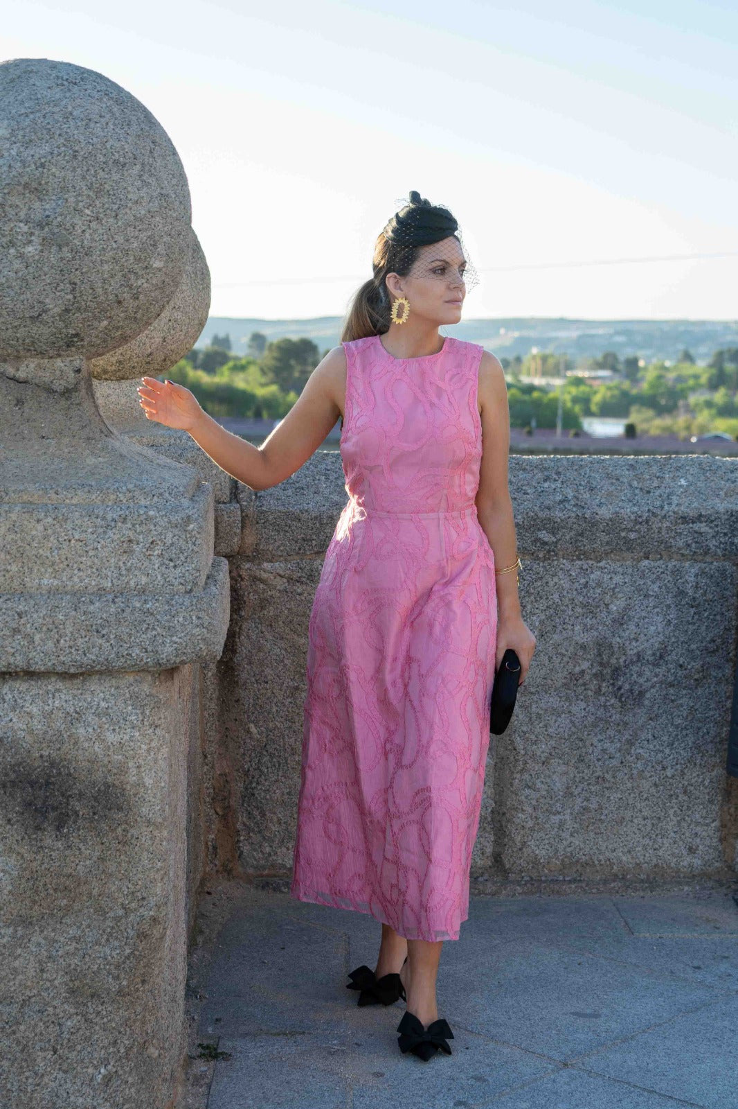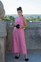 Midi dress with a round neckline, open back, bow at the waist, flared cut. In pink.