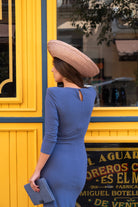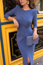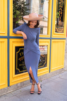 Dress Silk knit midi dress with a round neckline, long sleeves, gathered cuffs, and a front slit. In blue.