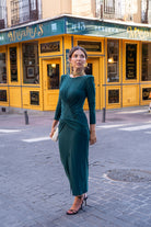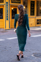 Dress Silk knit midi dress with a round neckline, long sleeves, gathered cuffs, and a front slit. In green.