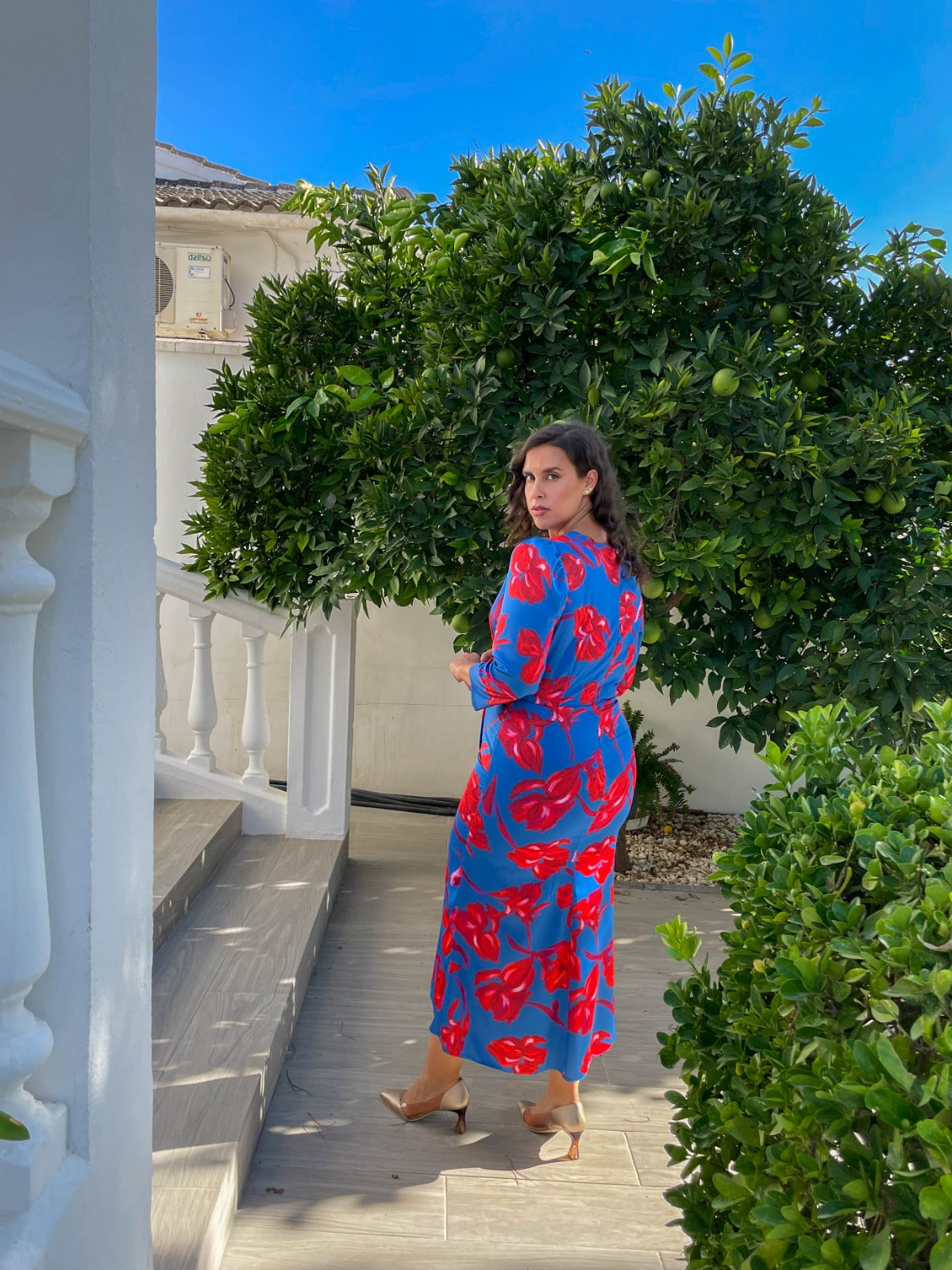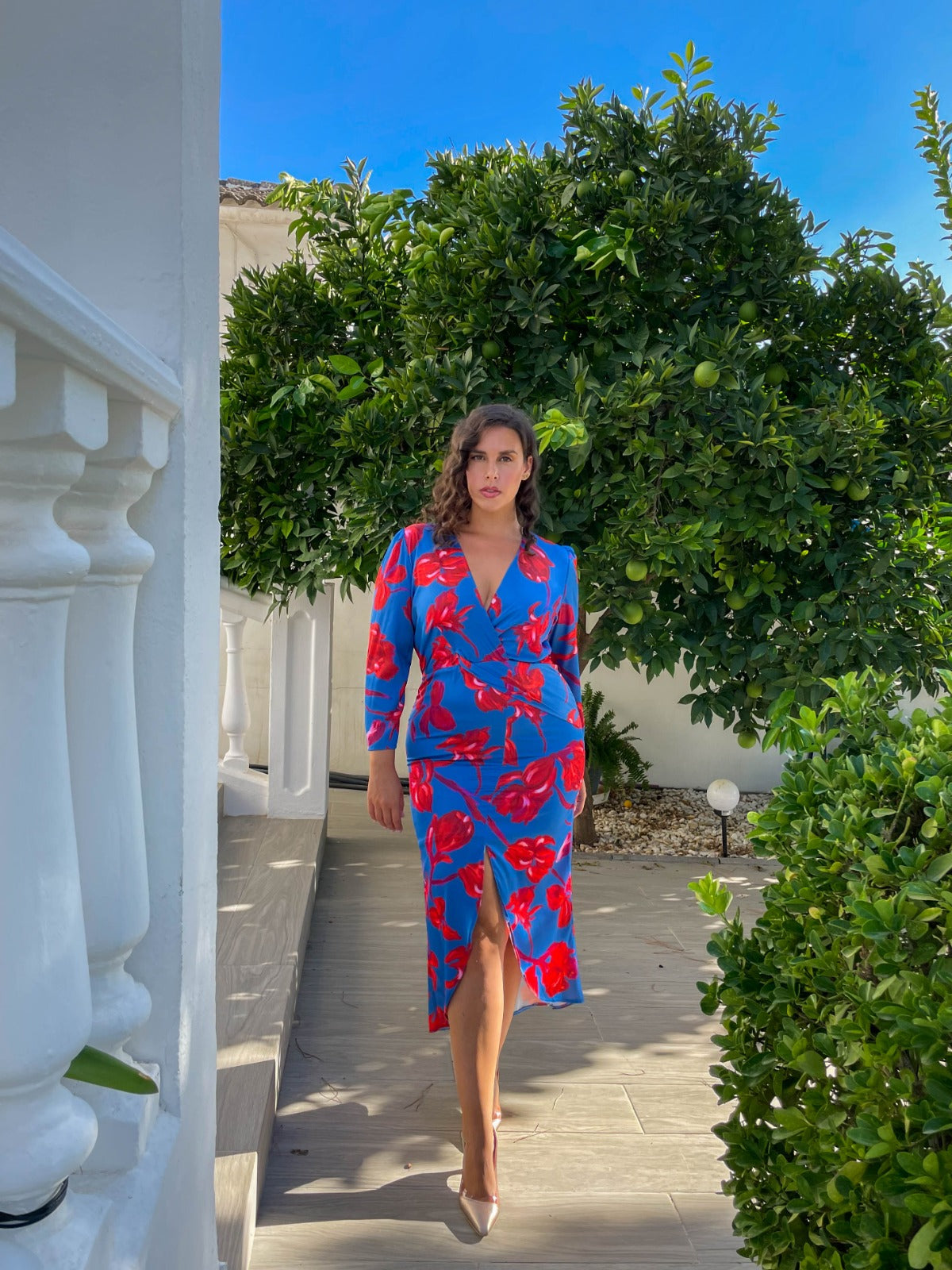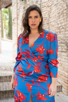Long-sleeved dress, crossover neckline, longer at the back, tulip-shaped front opening. Flowing blue fabric with red print.