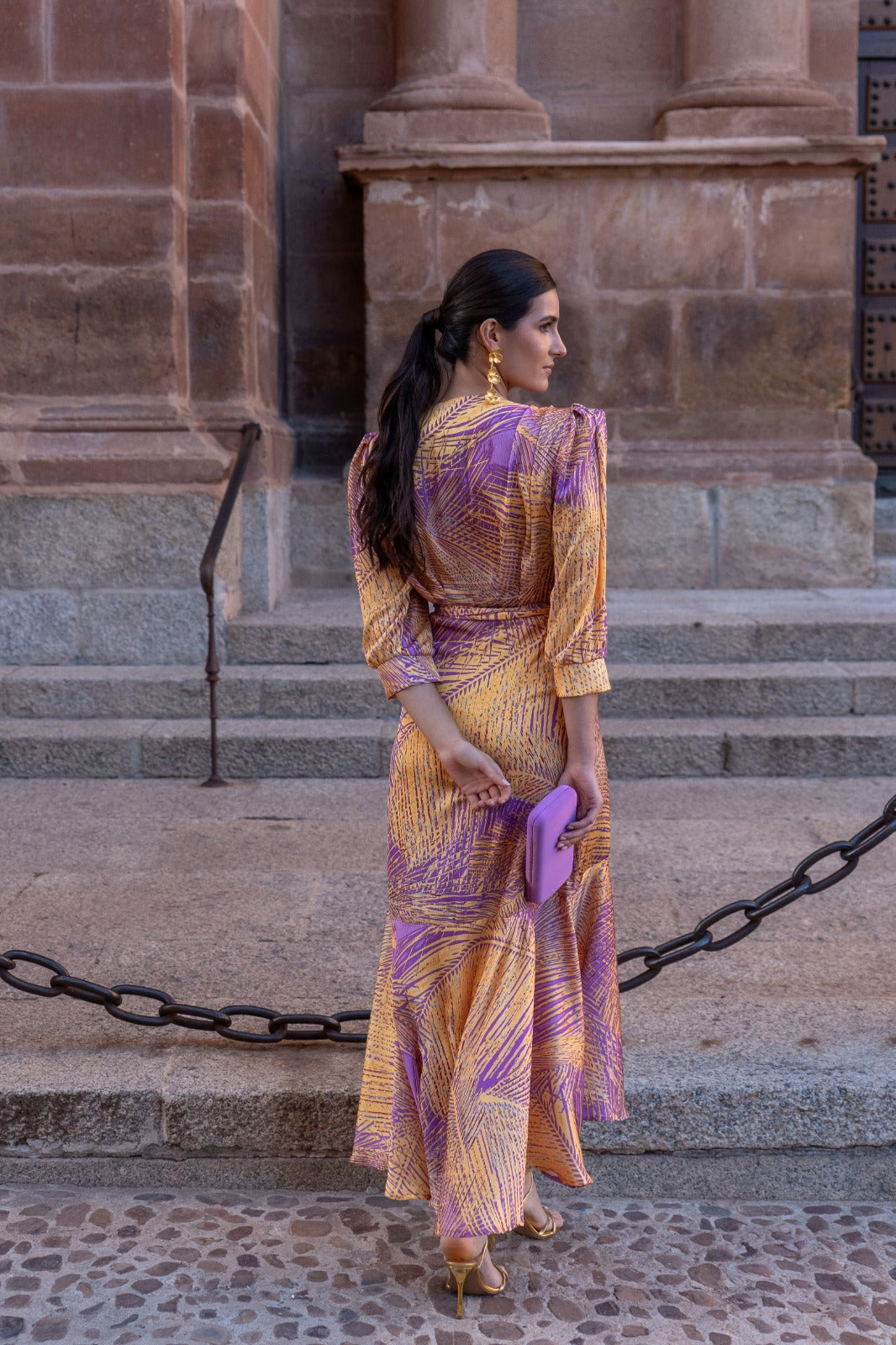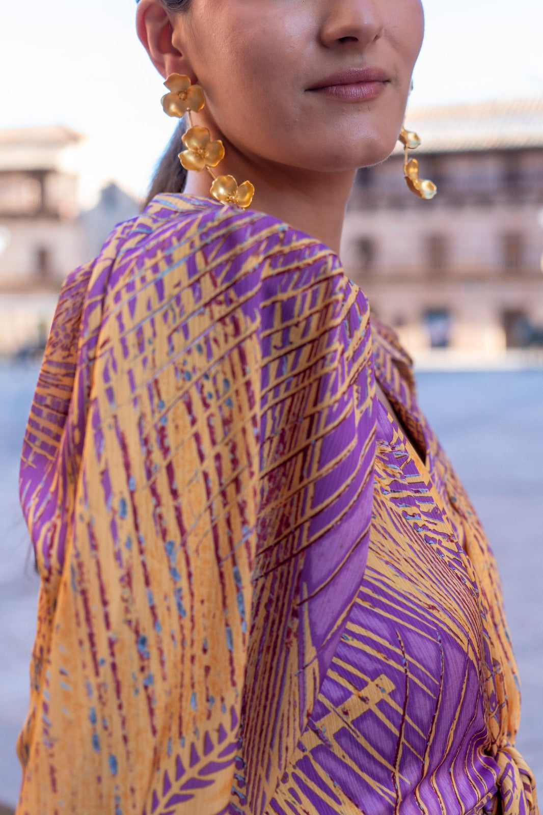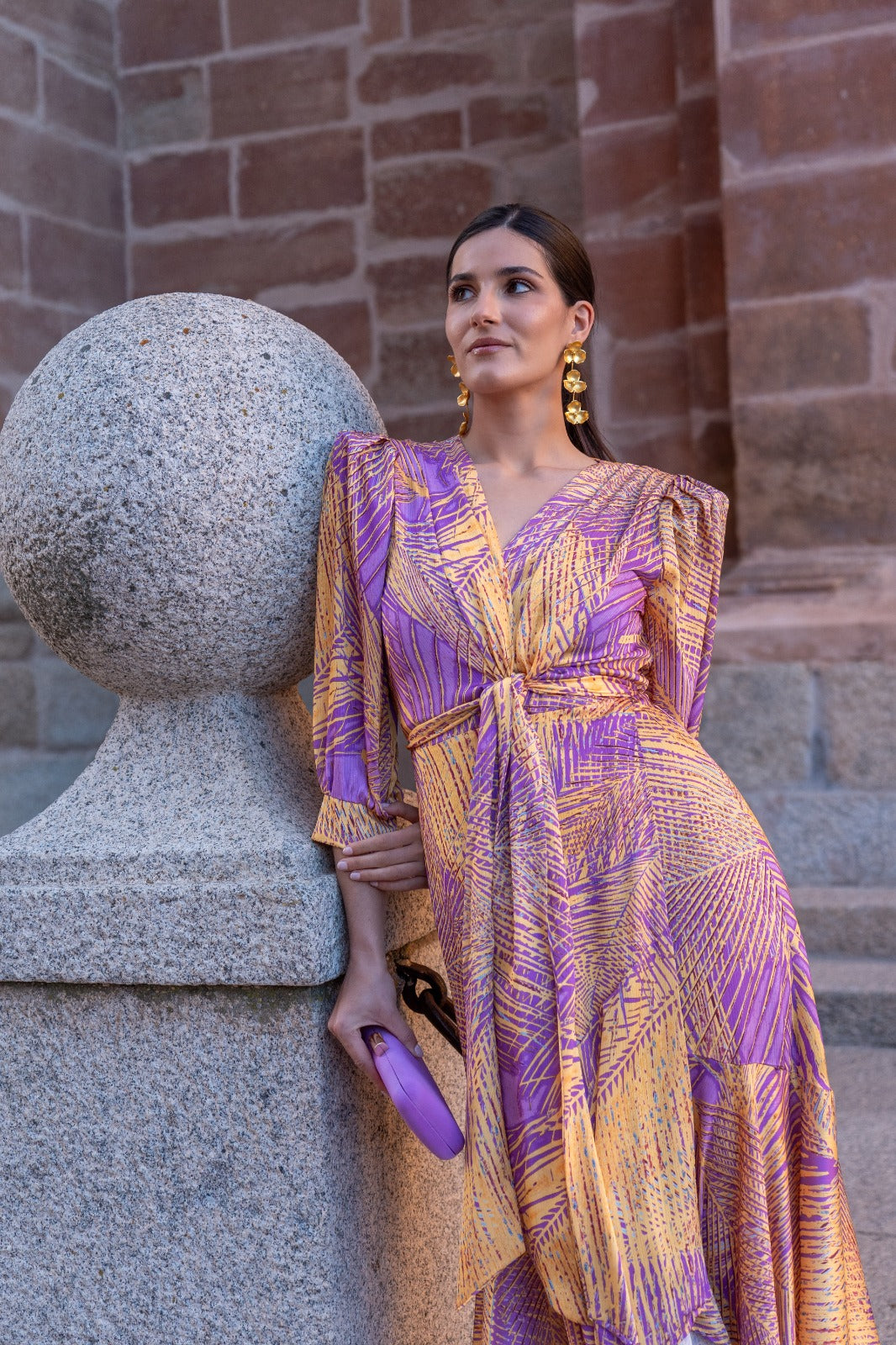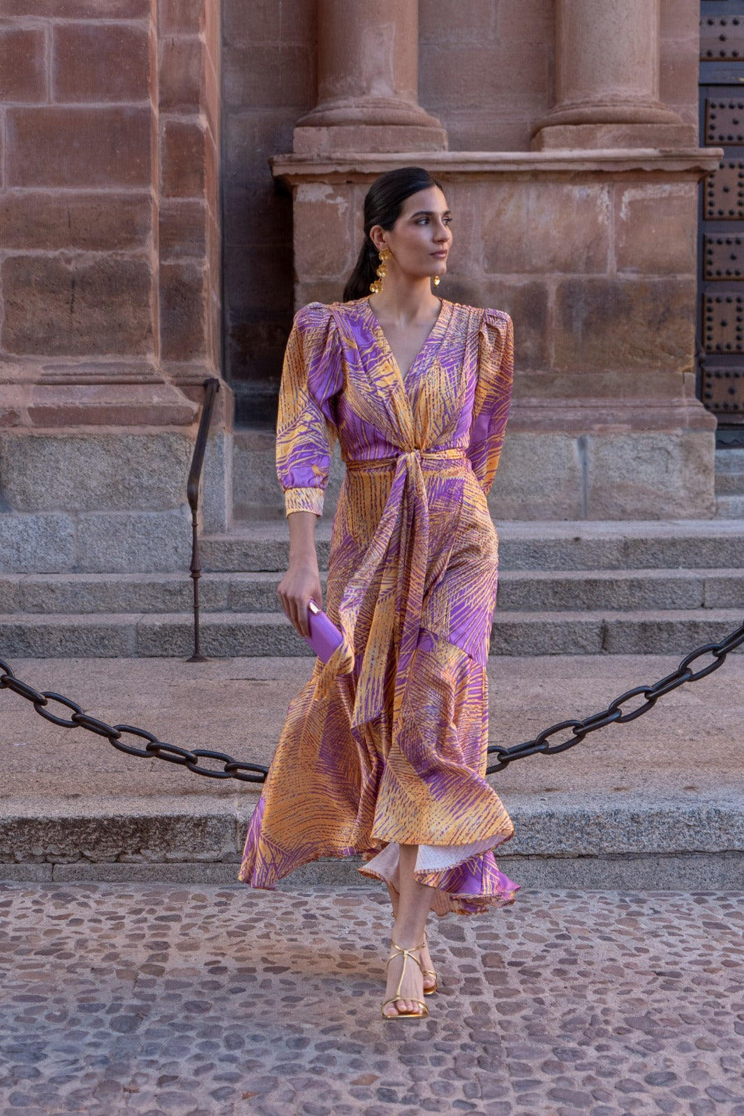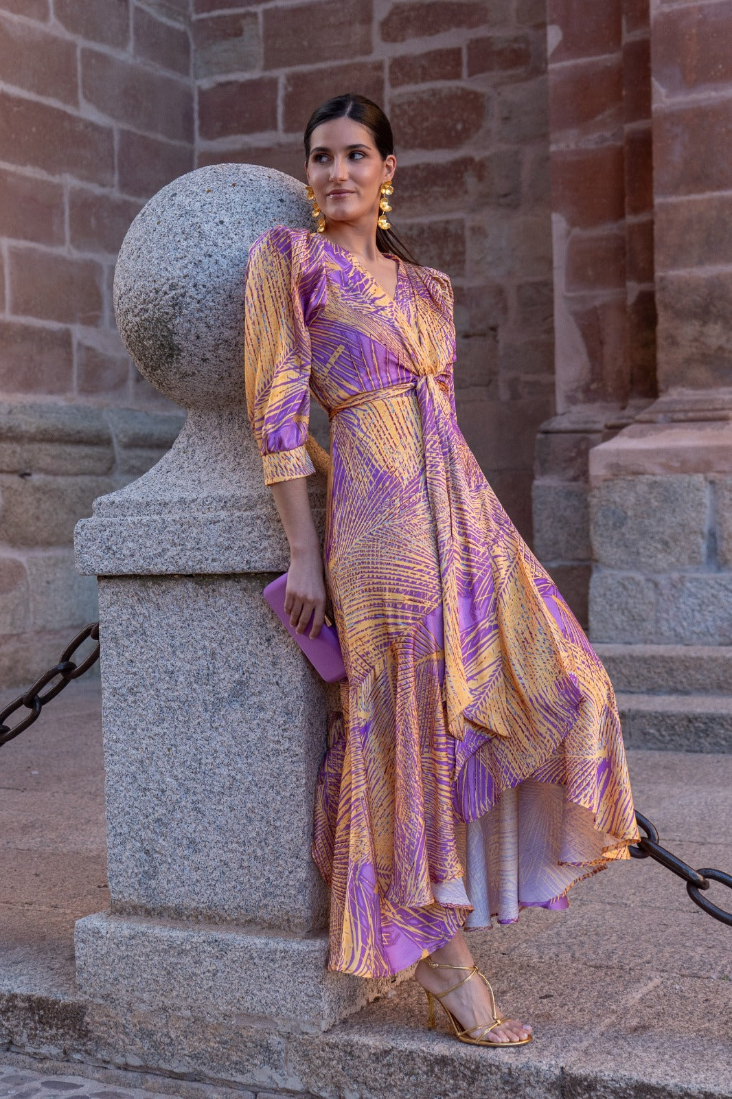 Midi dress, flowy, wrap style with knot, half sleeves and cuffs, fitted front, longer back. In printed colors.