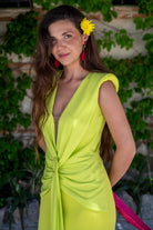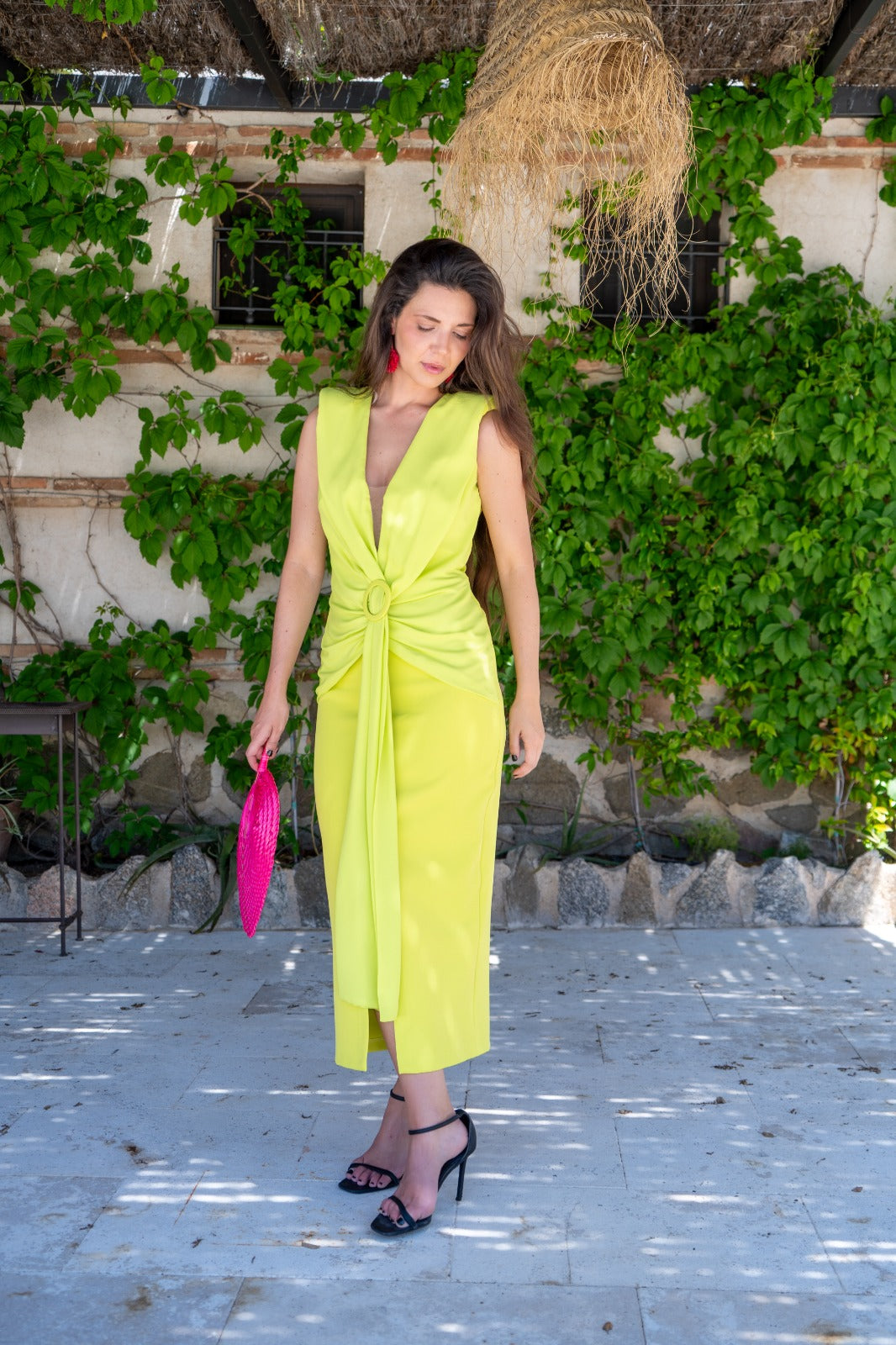 Sleeveless midi dress with a V-neckline, center buckle, and front slit. In lime.