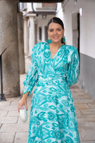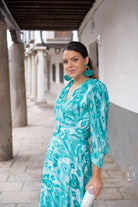 Wrap dress with a neckline, French sleeves with cuffs, a flared skirt that extends further in the back, and a belt included. Printed green.