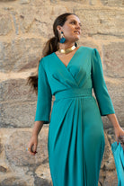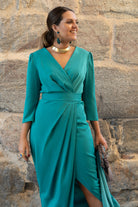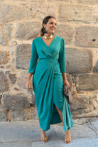 Midi dress, crossover neckline, three-quarter sleeves, pleated waist with belt, front side slit. In green.