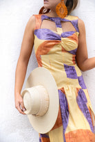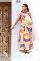 Long dress with round neckline and open details, sleeveless, and a flared skirt. Printed in a variety of colors.
