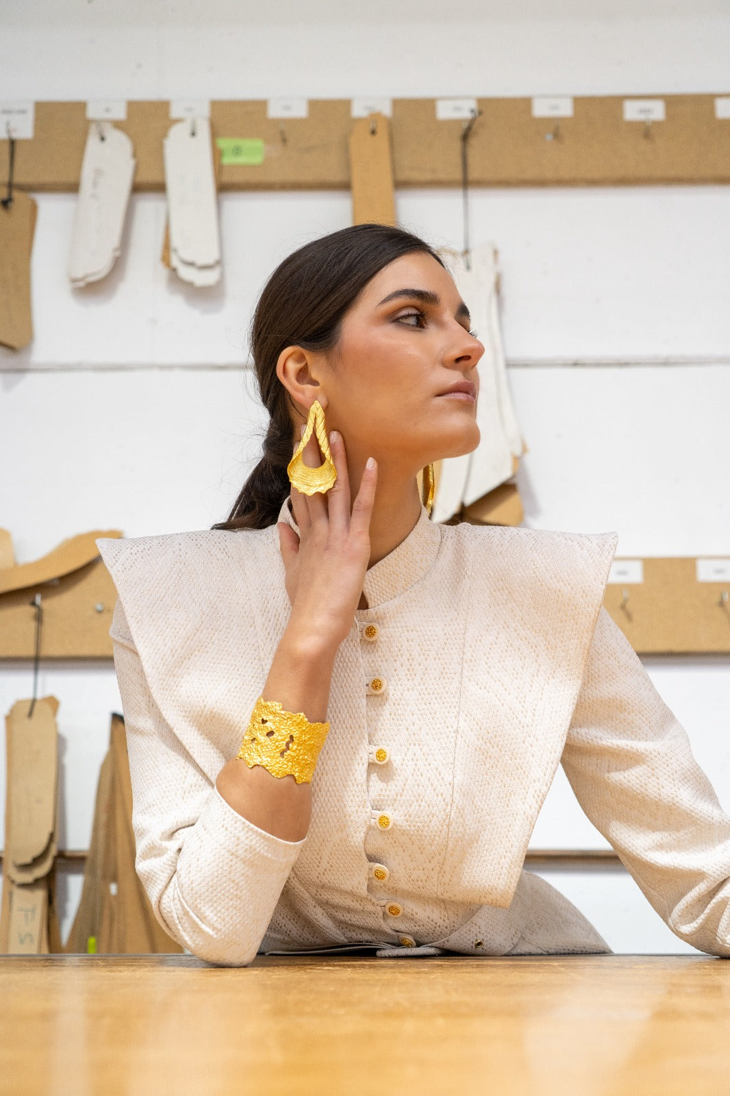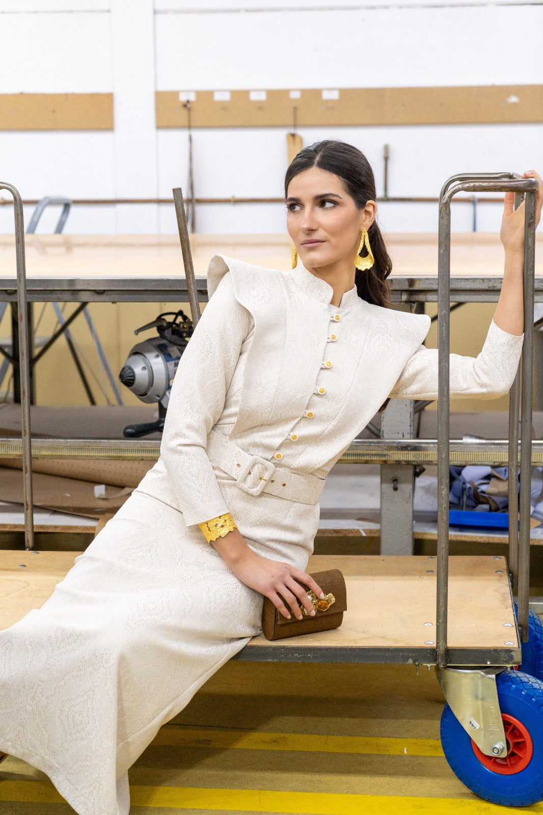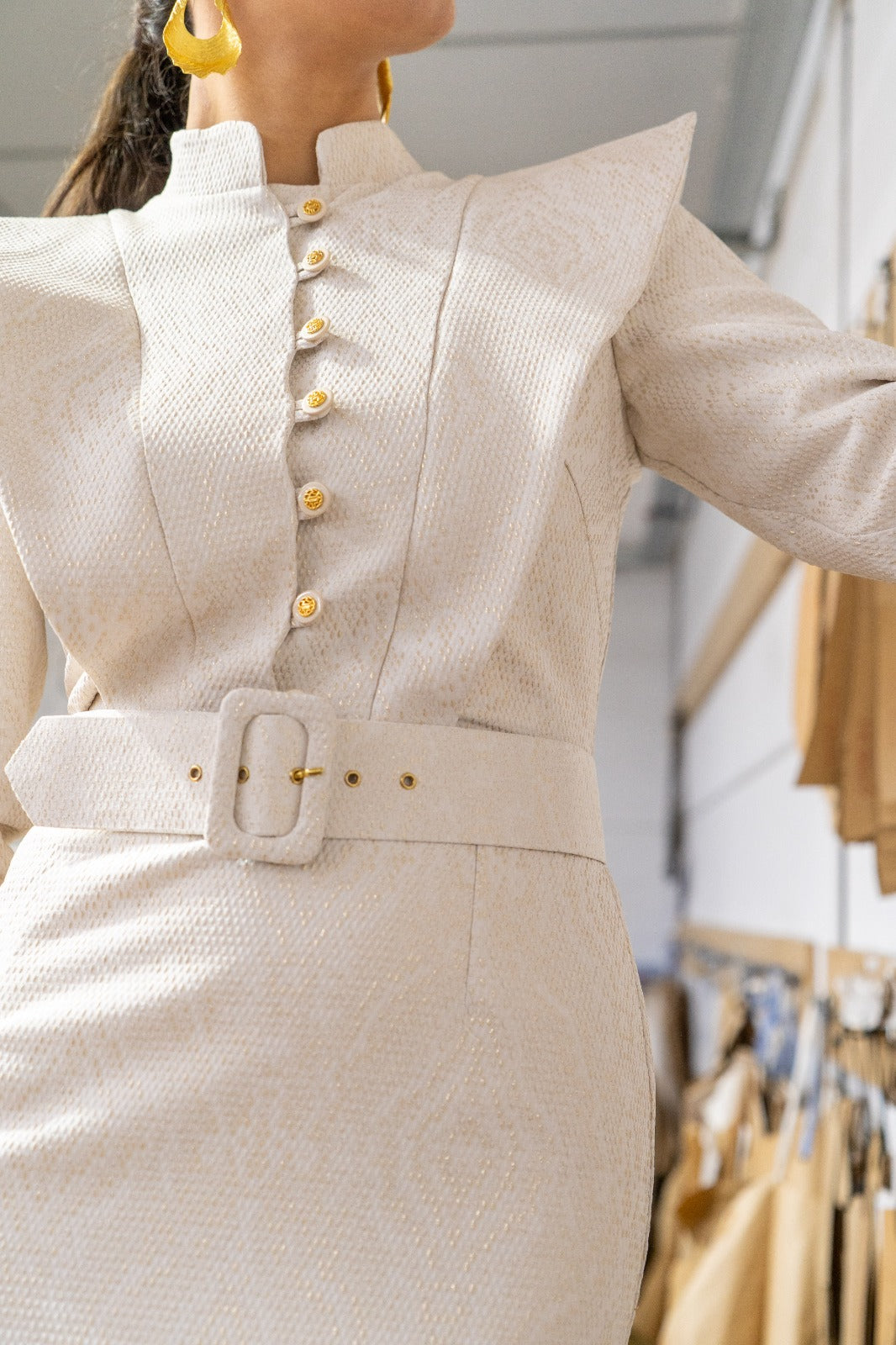 Midi dress, high neckline, three-quarter sleeves, structured shoulder pads with wing detail, front button detail, cinched waist with belt, back slit. In diamond-patterned lurex jacquard.