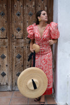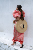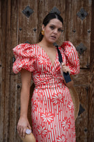 V-neck dress with a knotted finish, short puffed sleeves, and fringed hem. Two-tone beige and orange print.