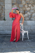 Long dress, asymmetrical on one side and puff sleeves on the other, draped with a ruffle at the bottom. In red satin.