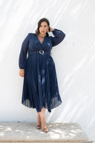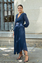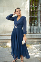 Midi dress with a crossover neckline, long sleeves with cuffs, a fitted waist, a belt, and a shaped pleated skirt. Made of blue chiffon.