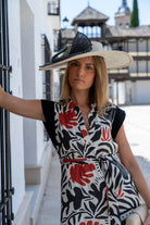 Long dress with a V-neck, sleeveless, belt included, and ruffle at the bottom. In a multi-colored print.