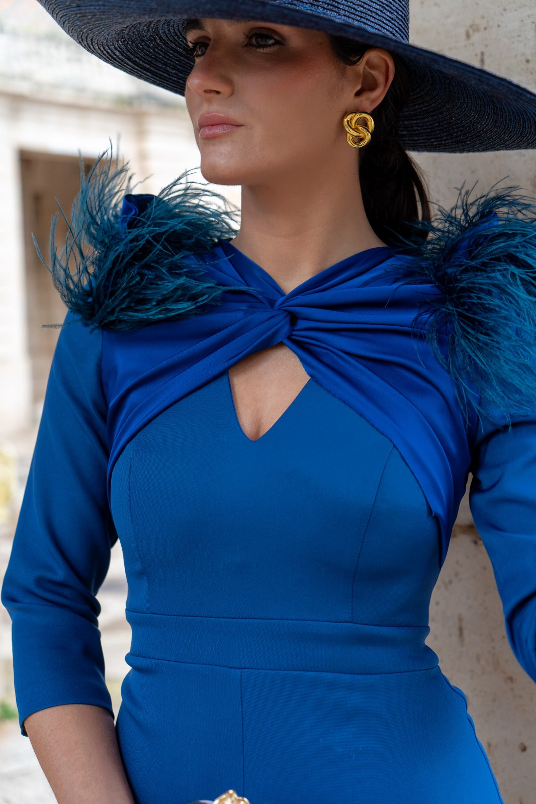 Midi dress, three-quarter sleeves, knot and teardrop neckline, feather detail on shoulders, front slit. In blue.
