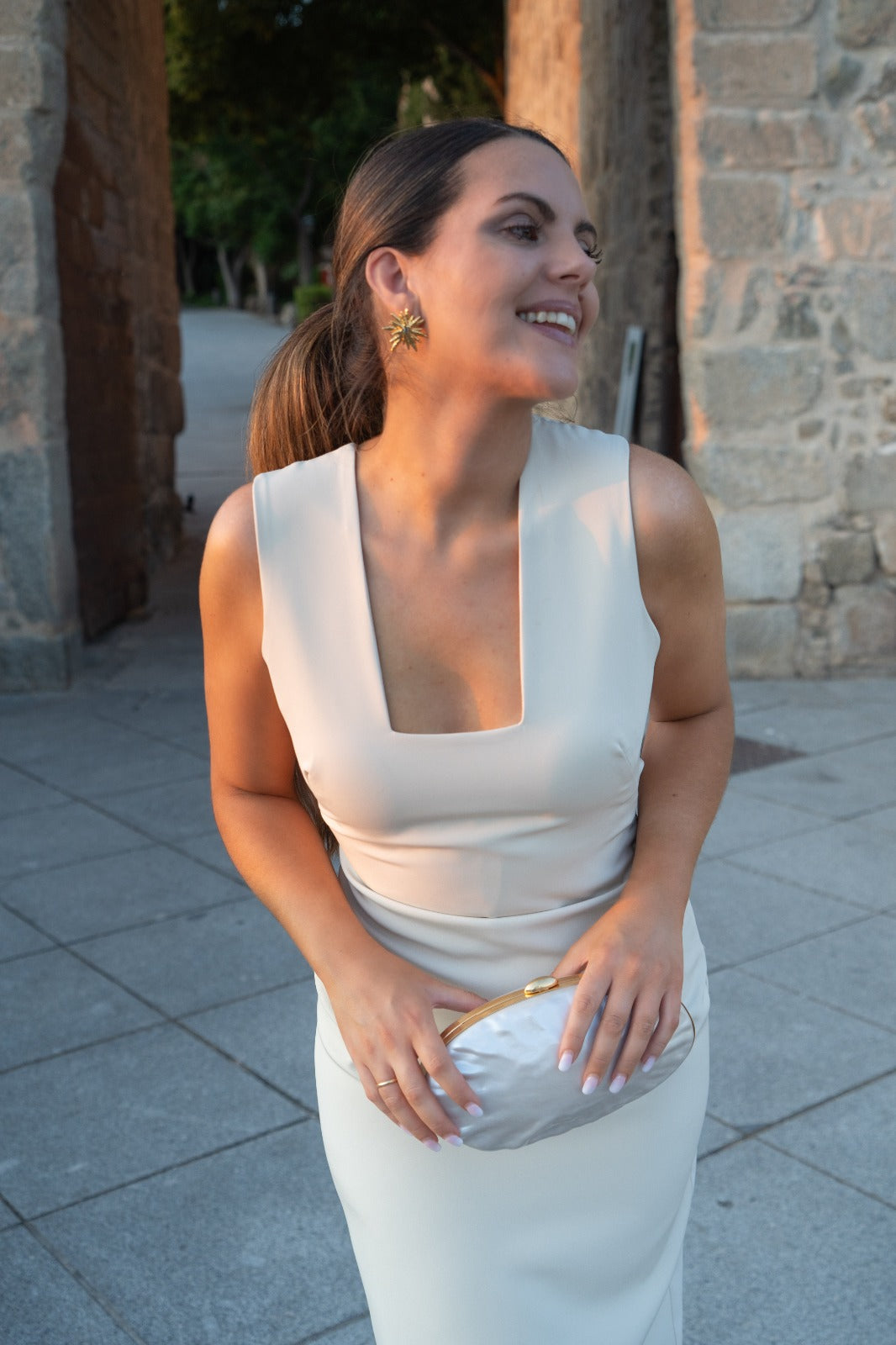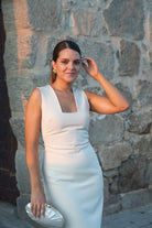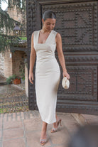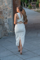 Midi dress with a square neckline, crossover back neckline, and back slit. In beige.