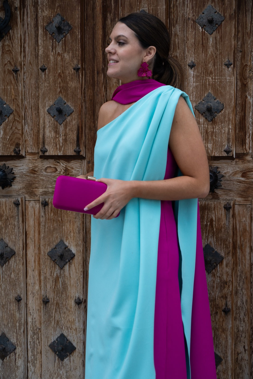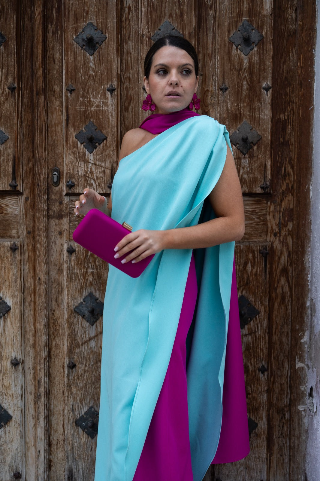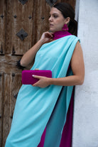 Long, asymmetrical dress, fuchsia at the bottom, a water-green cape over the top, and a bow at the neck. Two-tone pink and green.