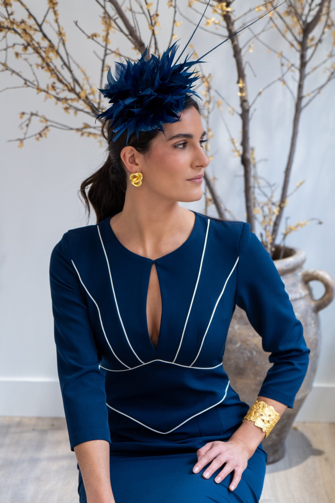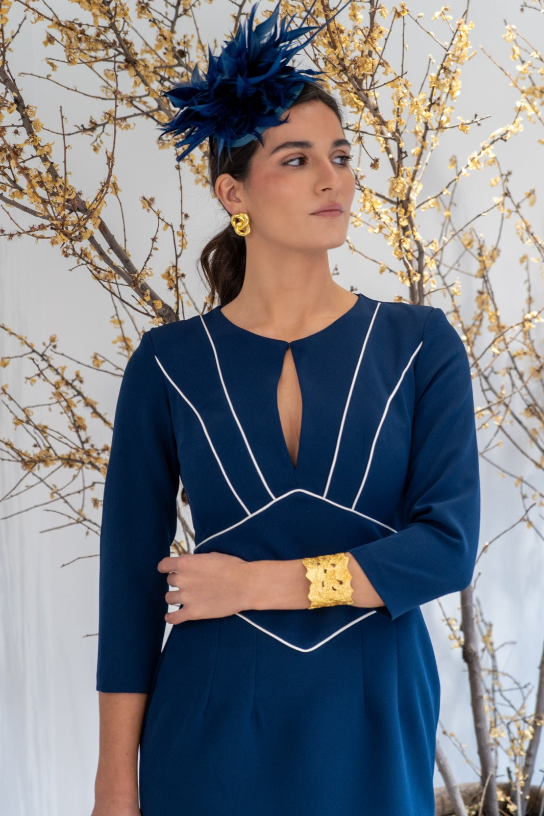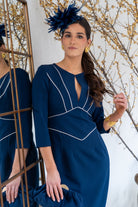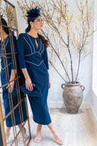 Midi dress, round neckline, teardrop detail at the center, three-quarter sleeves, back slit. Navy blue with white detailing.