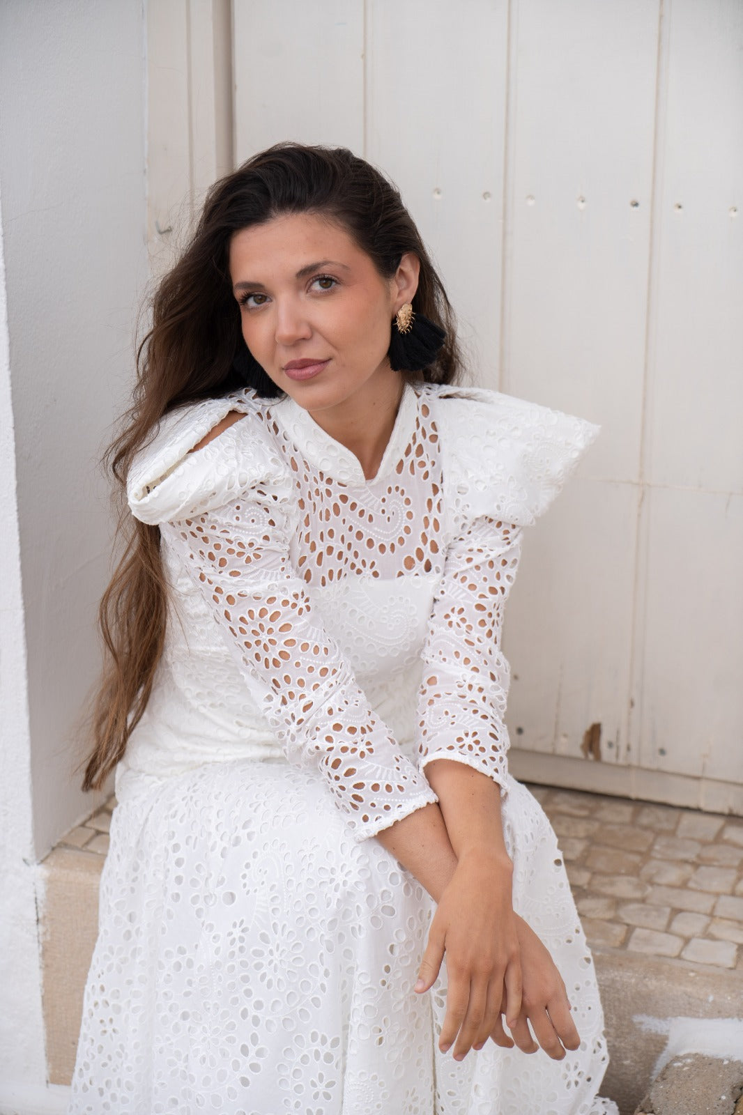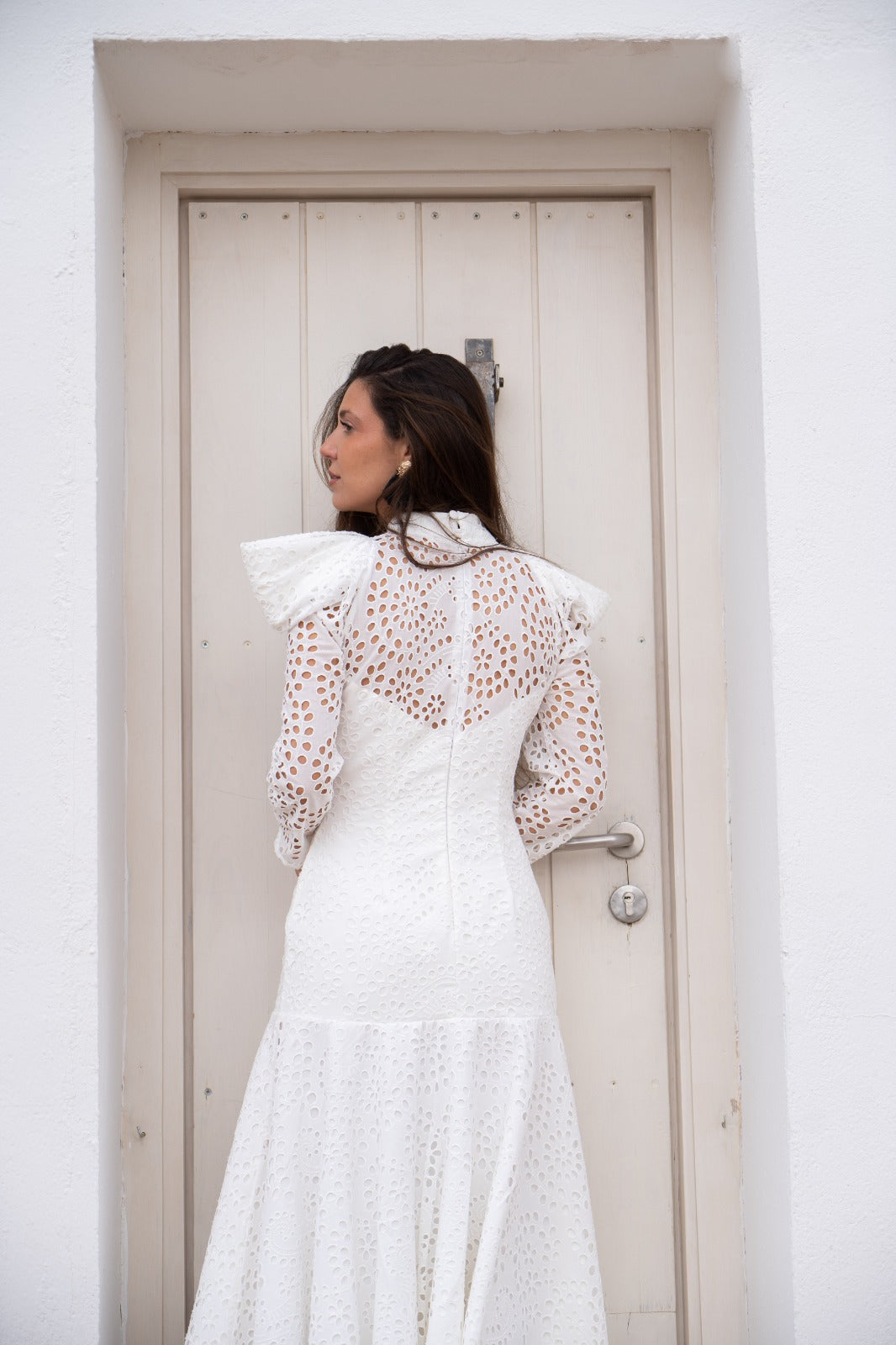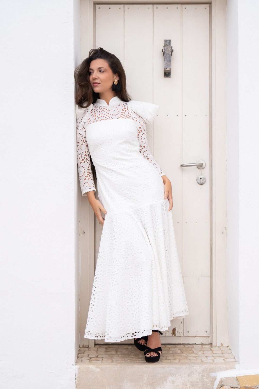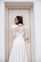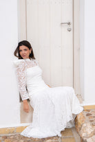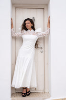 Maxi midi dress with a high neck, long sleeves, and a ruffle at the bottom. In white, openwork fabric.