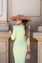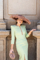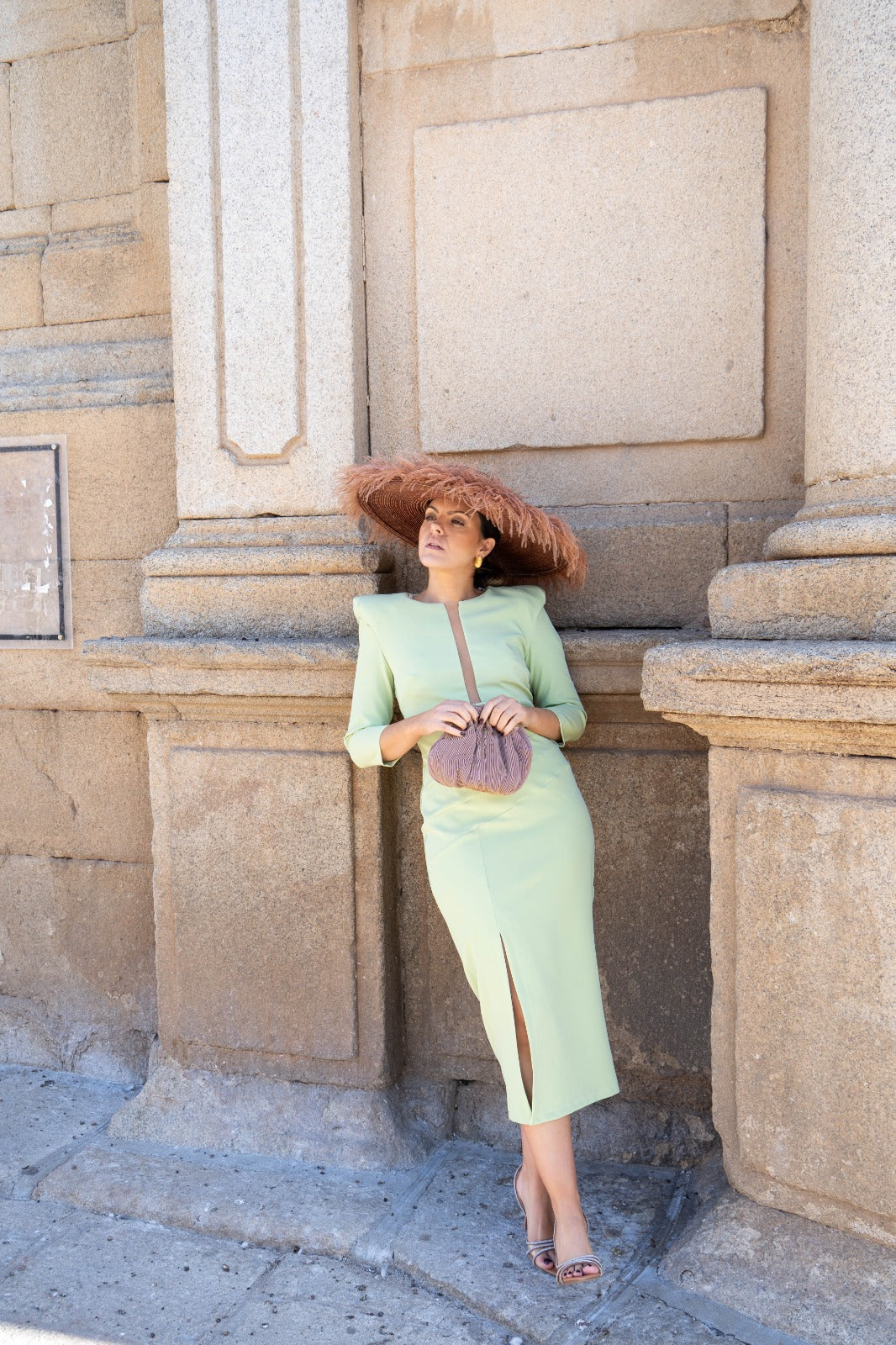 Midi dress, round neckline with transparent strap, French puffed sleeves on the shoulder, front opening on one side. In green.