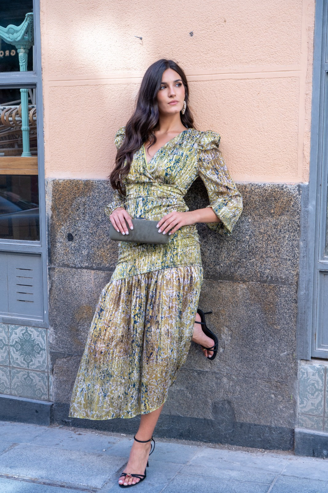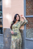Wrap dress with a V-neckline, long sleeves, gathered at the front and back, and a ruffle at the bottom. Printed green.