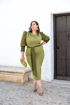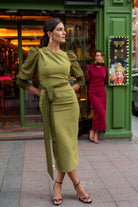 Midi dress with a round neckline, long plumeti sleeves with black polka dots, elasticated cuffs, back slit, and belt included. In green.