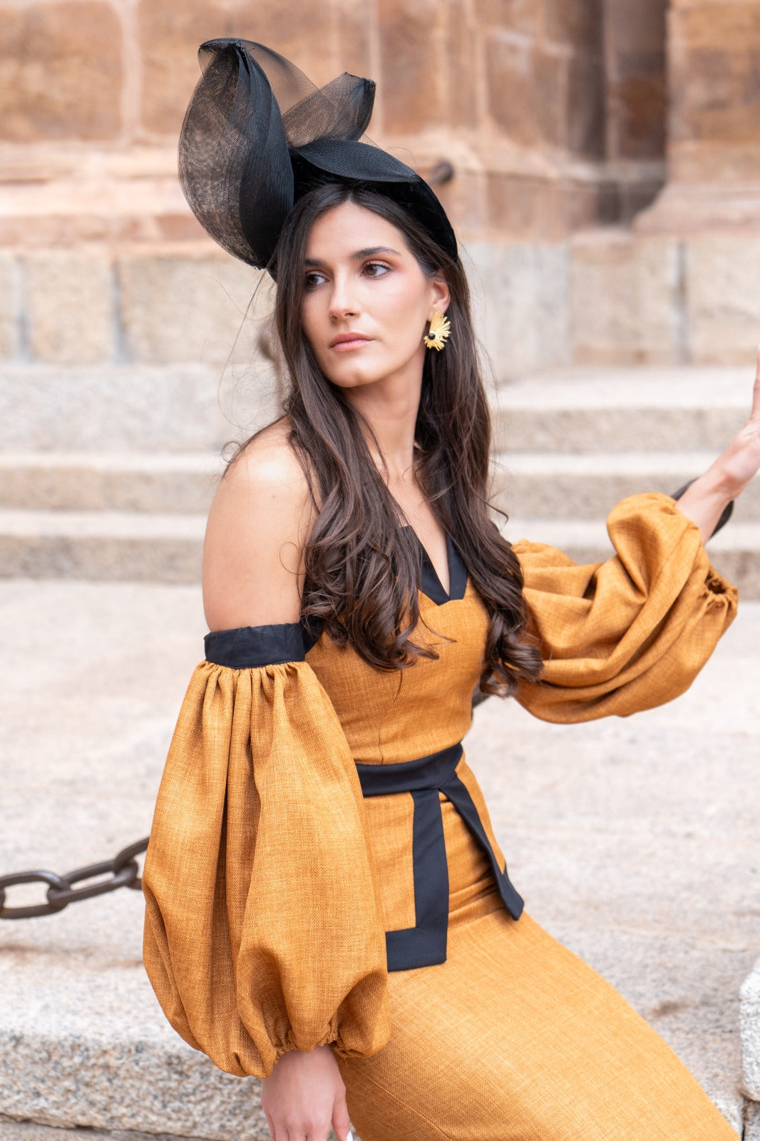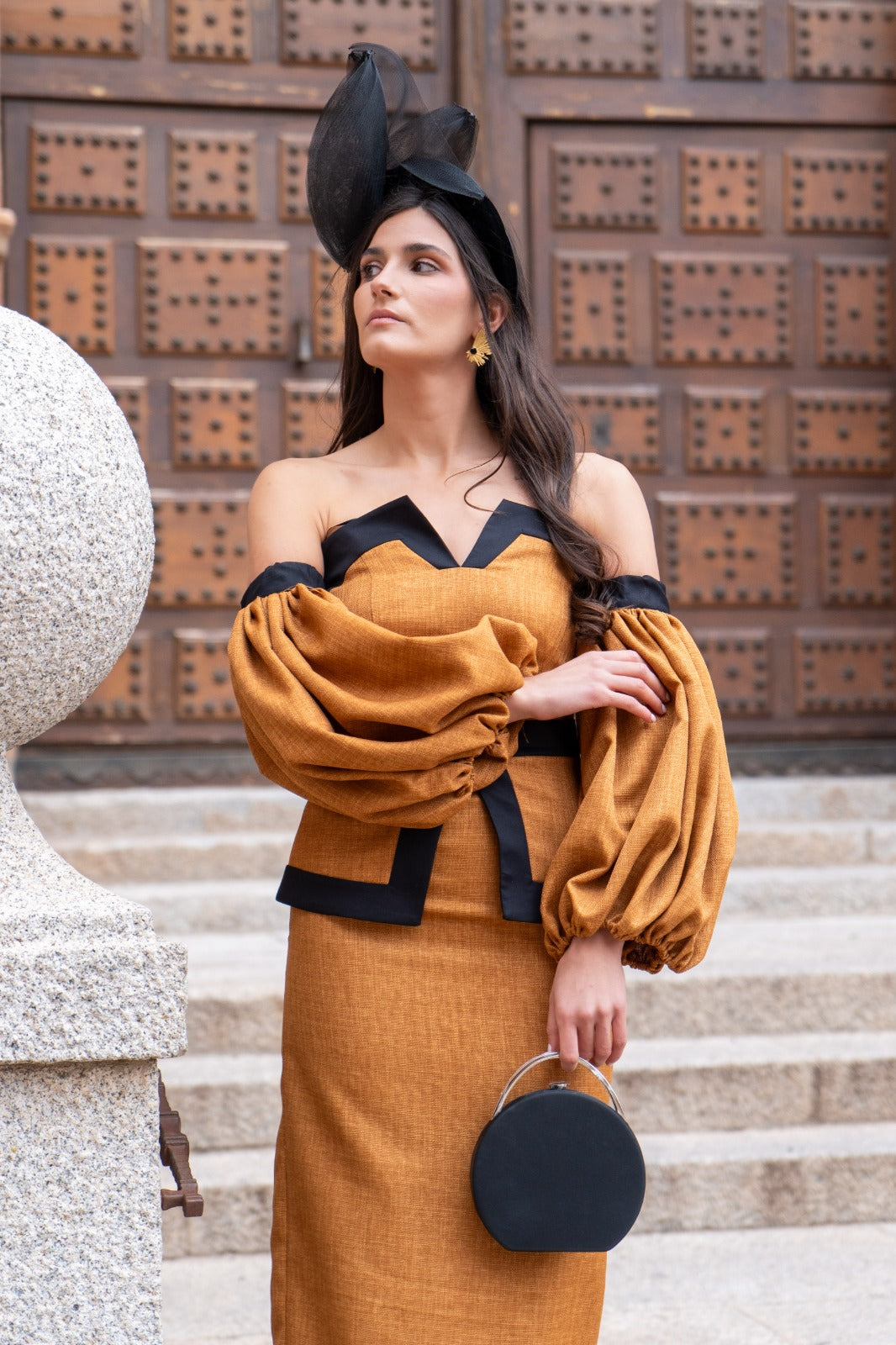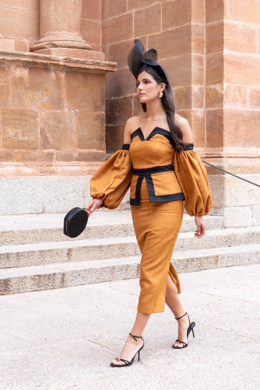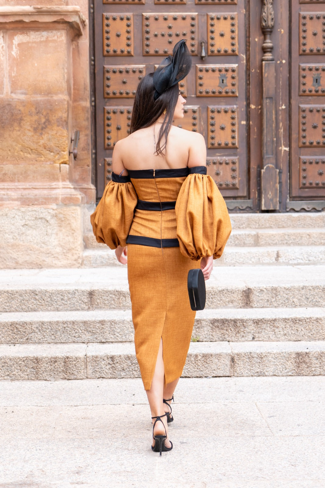 Vestido midi, escote bardot geométrico, mangas abullonadas, peplum en cintura, abertura trasera. En tejido tipo lino color teja combinado con negro.