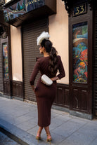 Midi dress, round neckline, long sleeves, ruffle on one side of the chest, front slit. In brown.