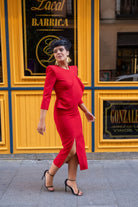 Midi dress with a round neckline, long sleeves, a ruffle at the side of the chest, and a front slit. In red.