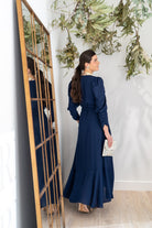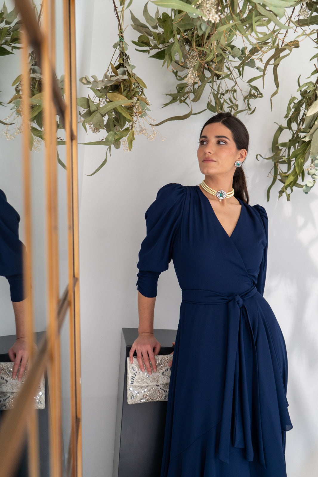 Wrap dress, short gathered sleeves, ruffle and shaping at the hem. In blue.