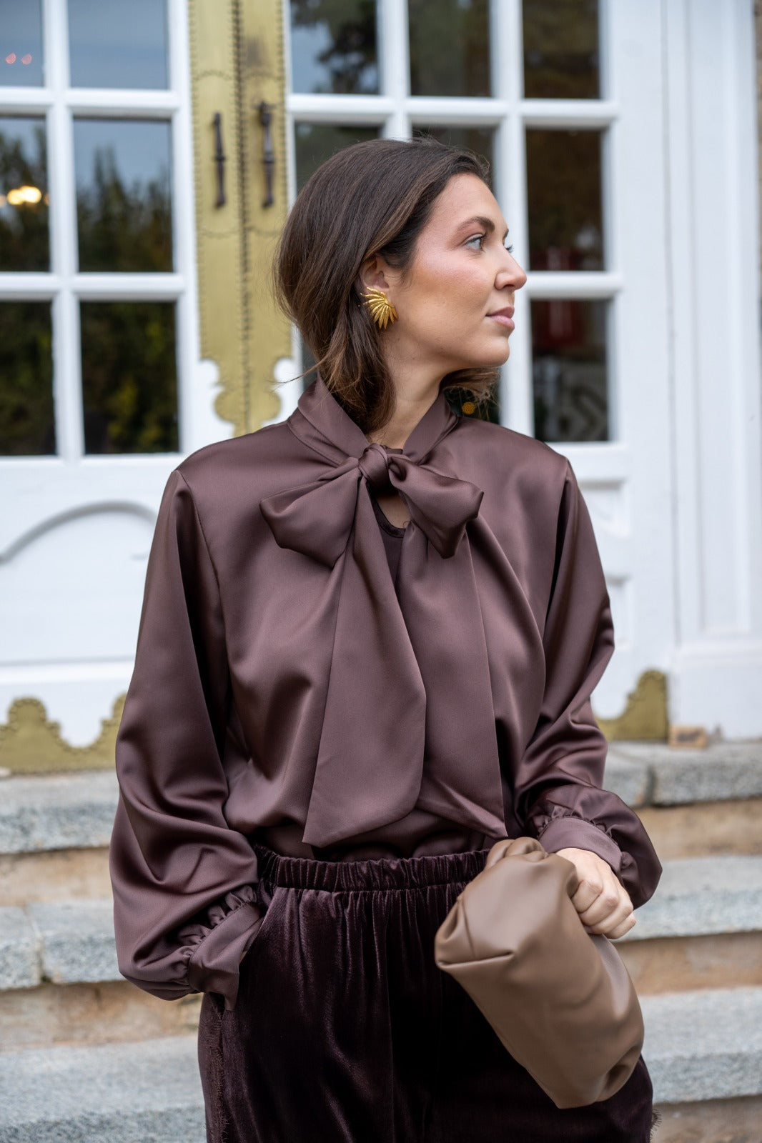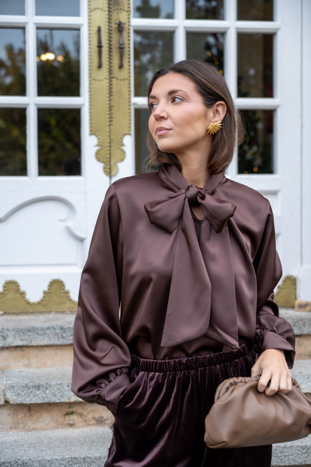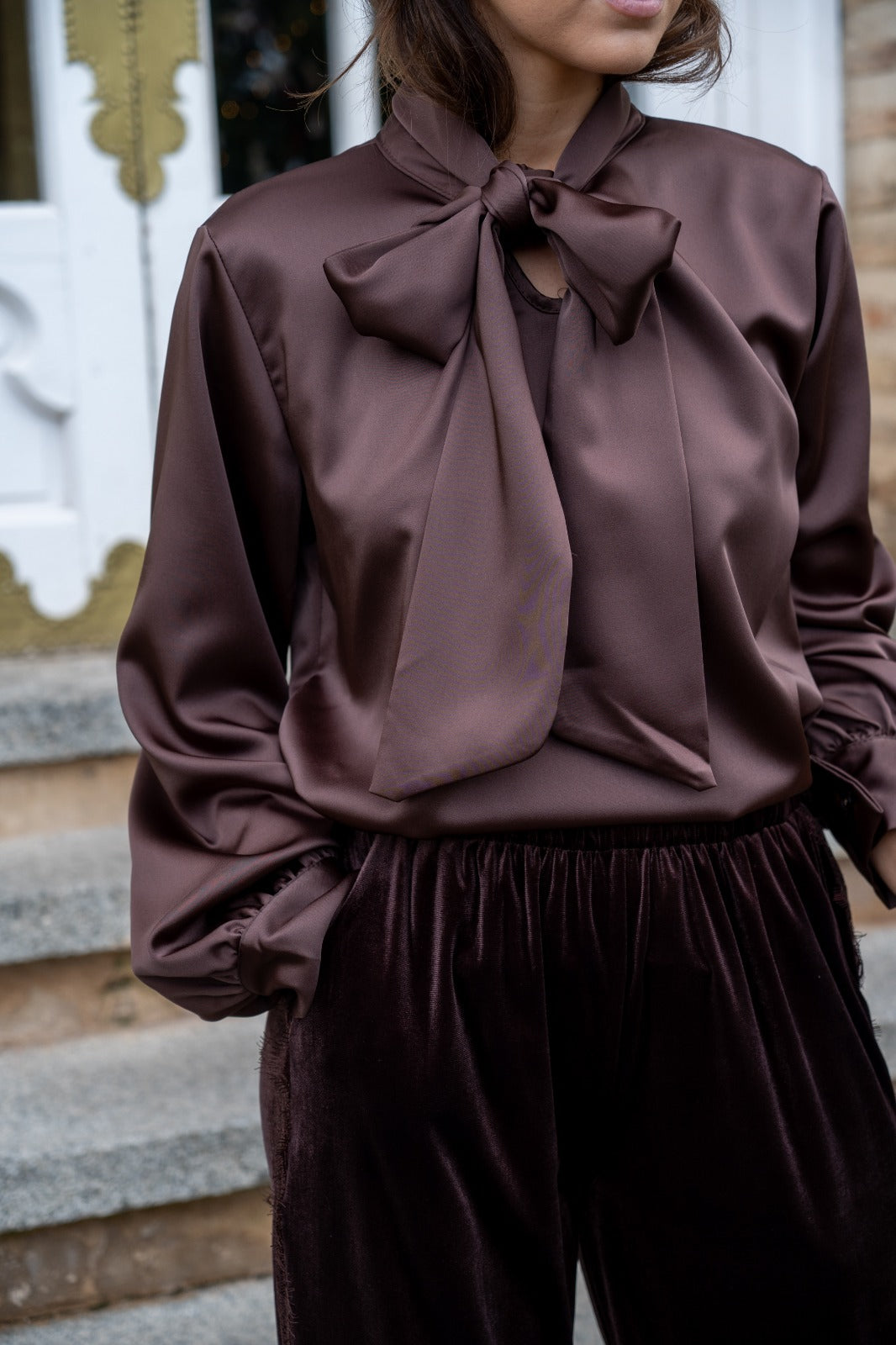 Blusa escote a pico, lazo en el cuello para anudar, manga larga con puño, en satén marrón.