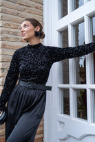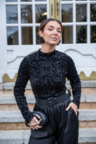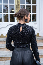 Body cuelo halter, manga larga, en color negro con lentejuelas.