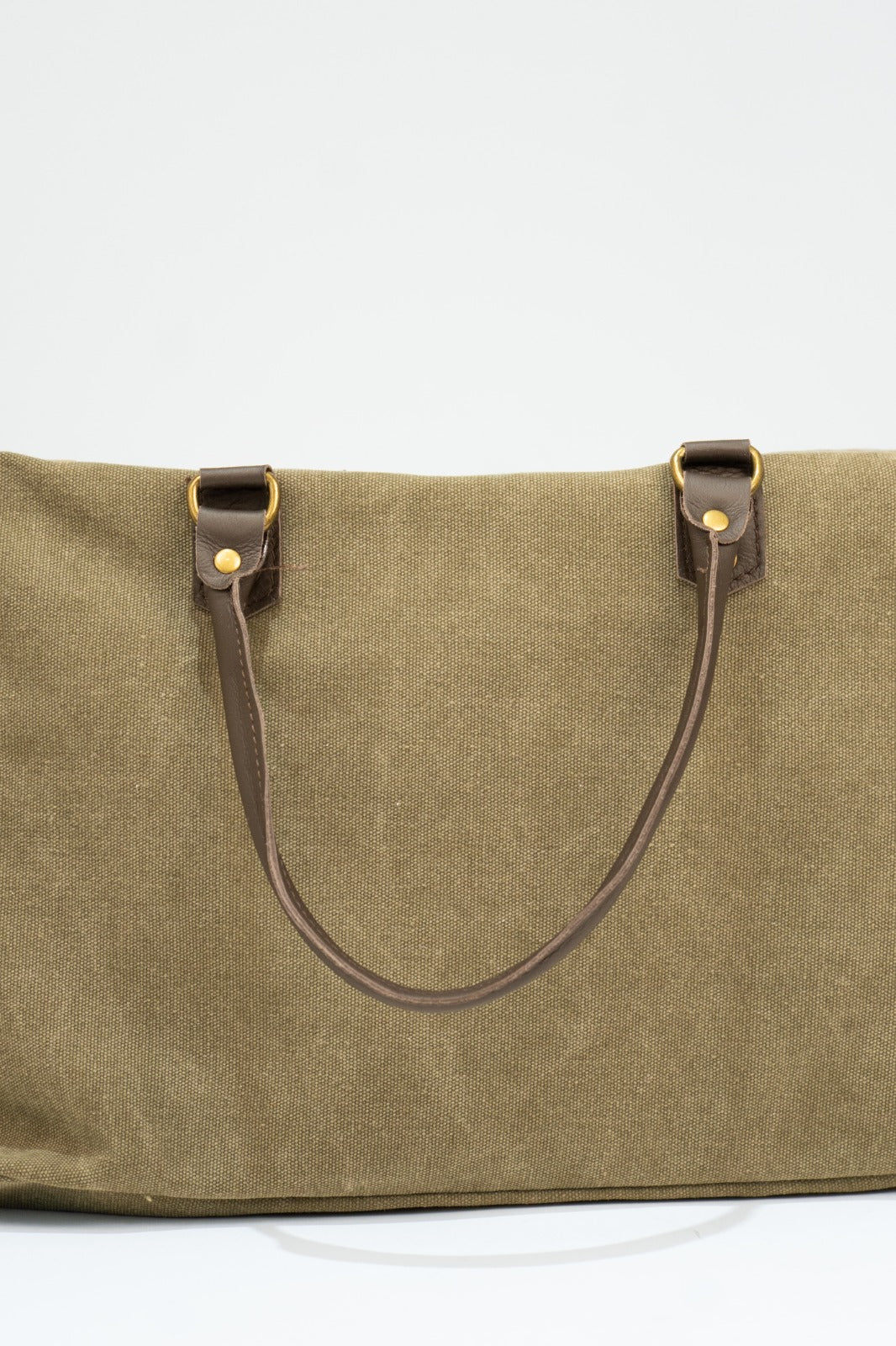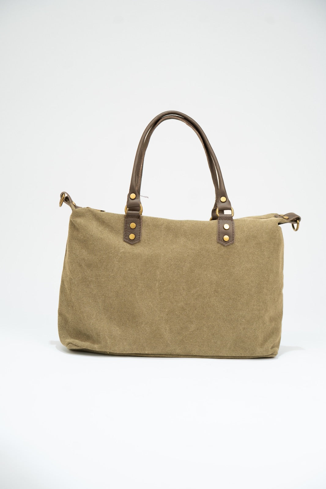 Bolso en loneta, con asas fijas en piel y correa extraíble y ajustable de algodón en color marrón chocolate. Cierre con cremallera, forro interior en negro y bolsillo interior. En color verde.