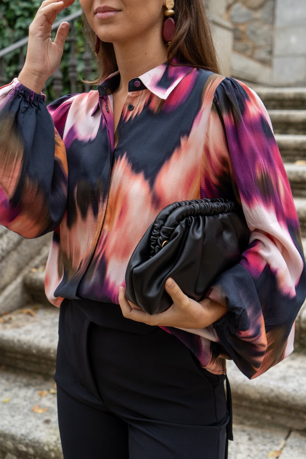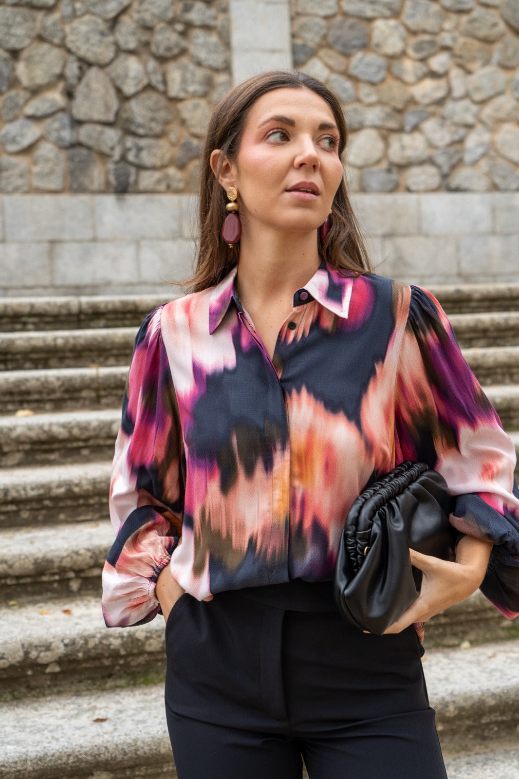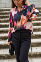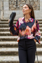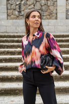 Camisa básica, manga larga con puño engomado, abotonada, estampado difuminado multicolor.