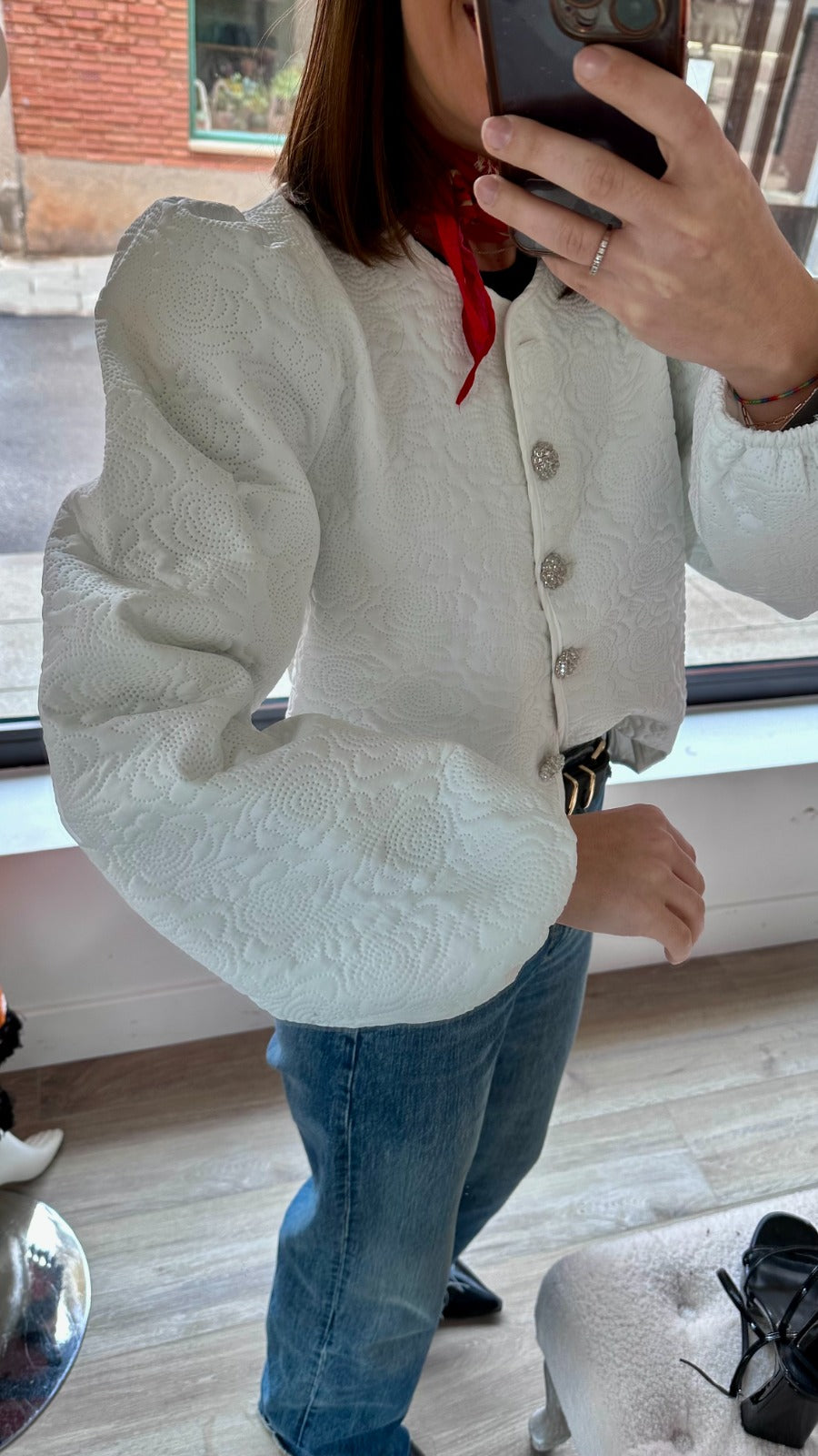 Chaqueta cuello redondo, manga larga abullonada con elastico en puño. En color blanco con dibujo.