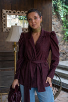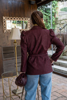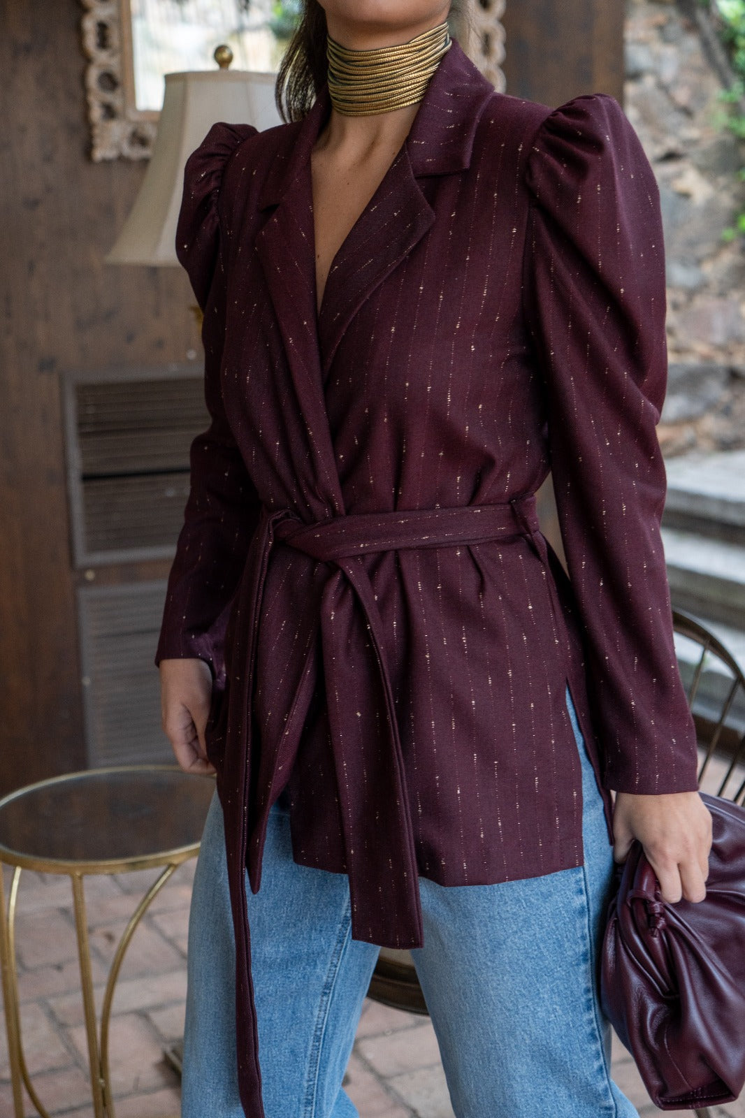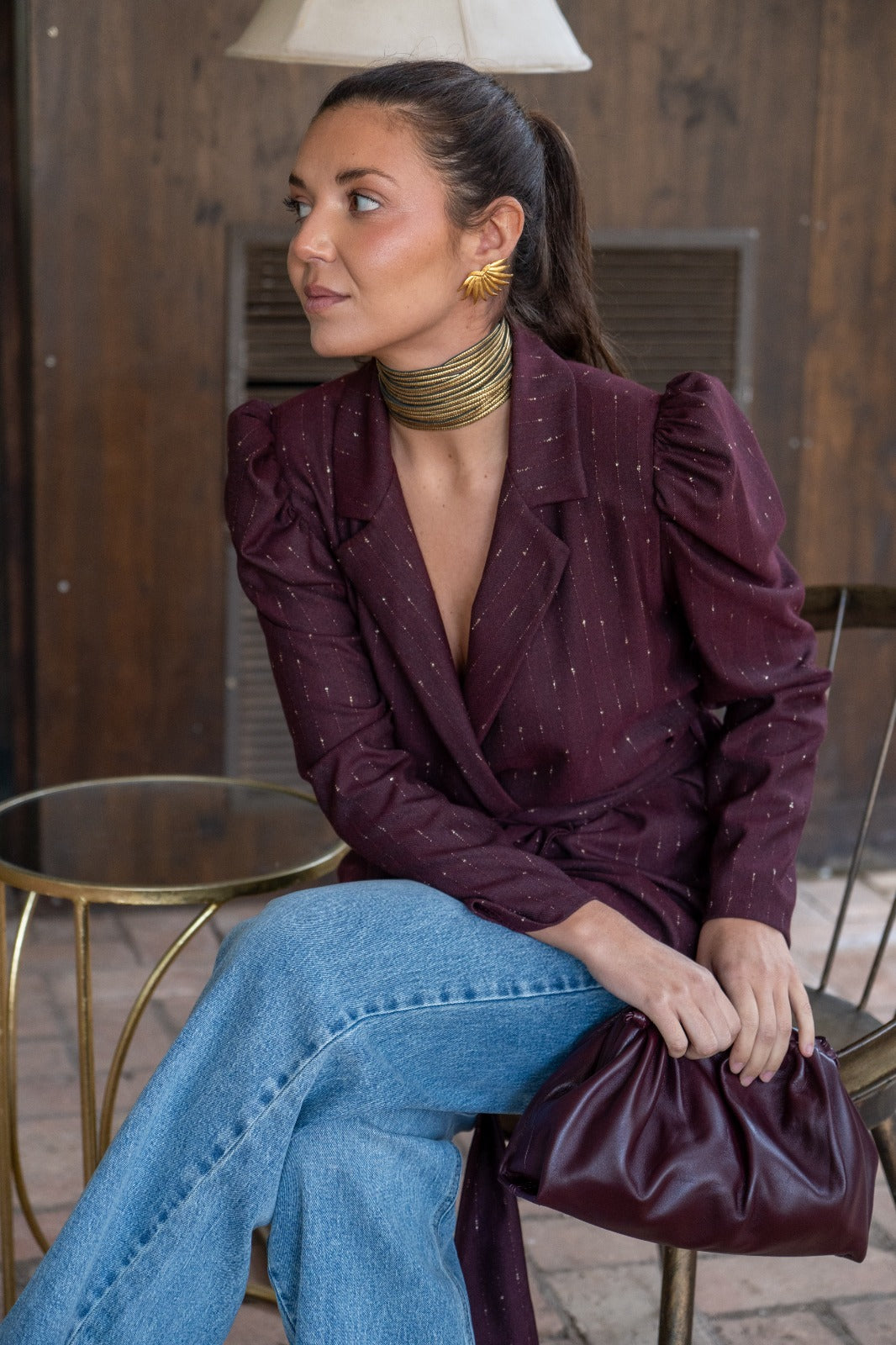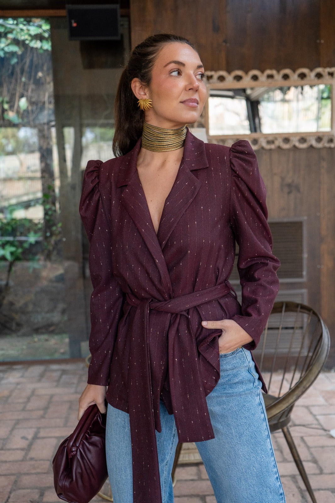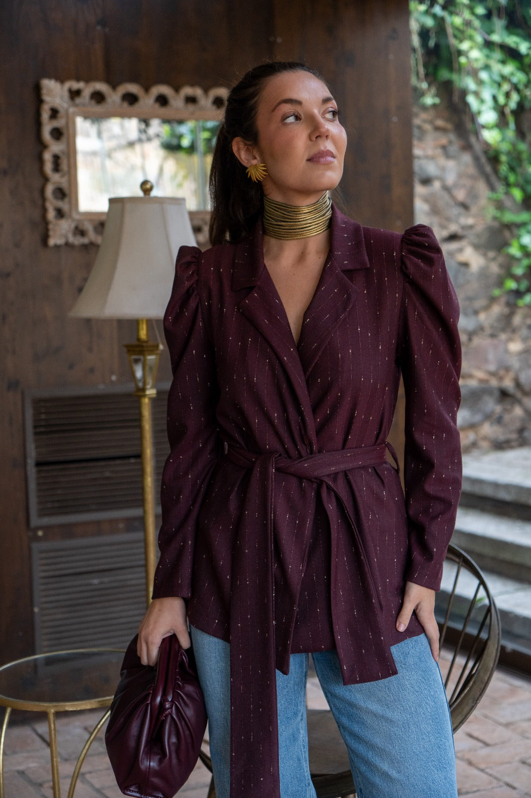Chaqueta cuello smoking, manga larga abullonada en hombro, cierre con cinturón, en color burdeos con lurex dorado,