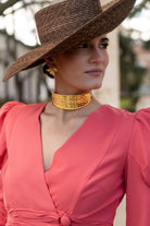 Choker en forma de hoja, ancho por delante y cordón fino por detrás, en color dorado.