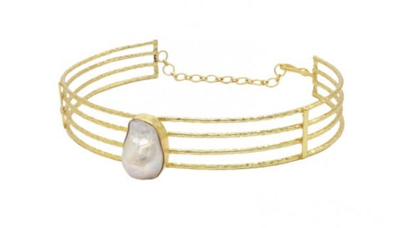Choker estático formado por líneas doradas que confluyen en una piedra central. Es un modelo grande y muy vistoso que no dejará indiferente a nadie y te aportara mucha luminosidad al rostro.