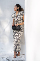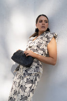 Conjunto compuesto por chaleco, escote cruzado, hombrera alta y falda cintura alta, abertura trasera. En negro con crochet beige.