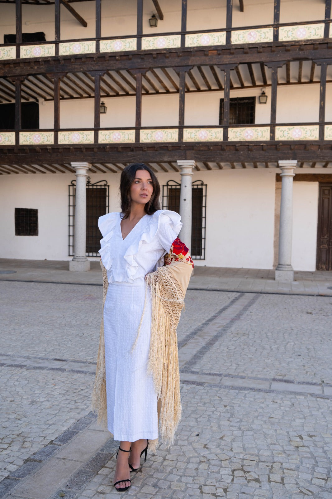 Conjunto compuesto por top escote a pico, volantes a los lados, manga francesa y falda con cinturilla, abertura delantera. En vichy blanco.