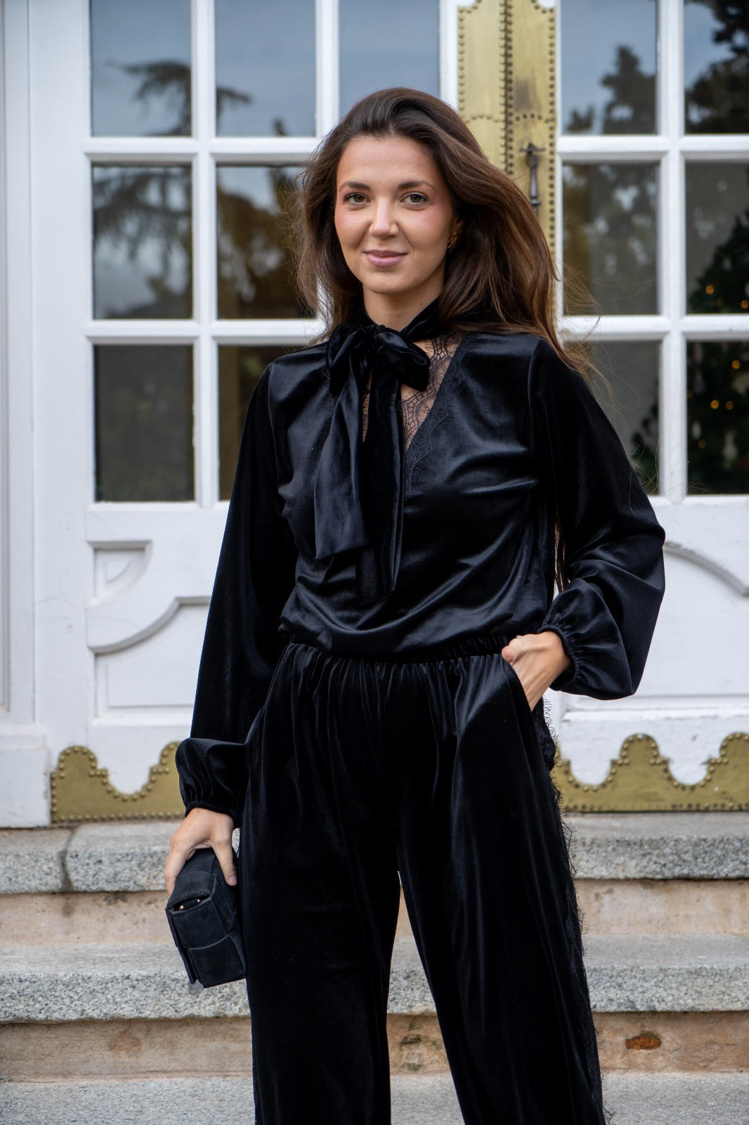Conjunto compuesto por blusa, escote a pico con puntilla, manga larga con puño engomado y pantalón bombacho, cintura engomada, puntilla en los laterales, en color negro.
