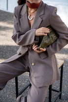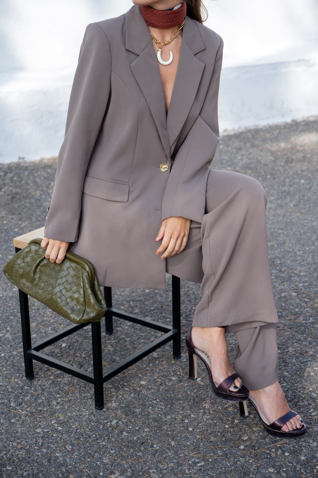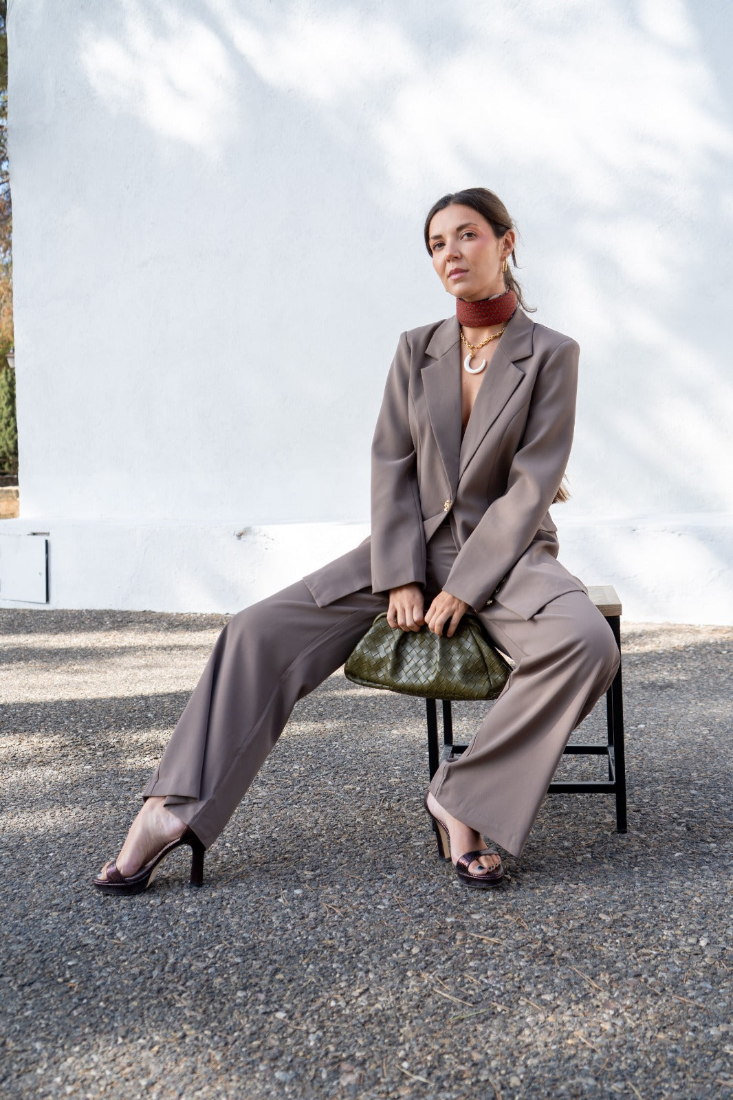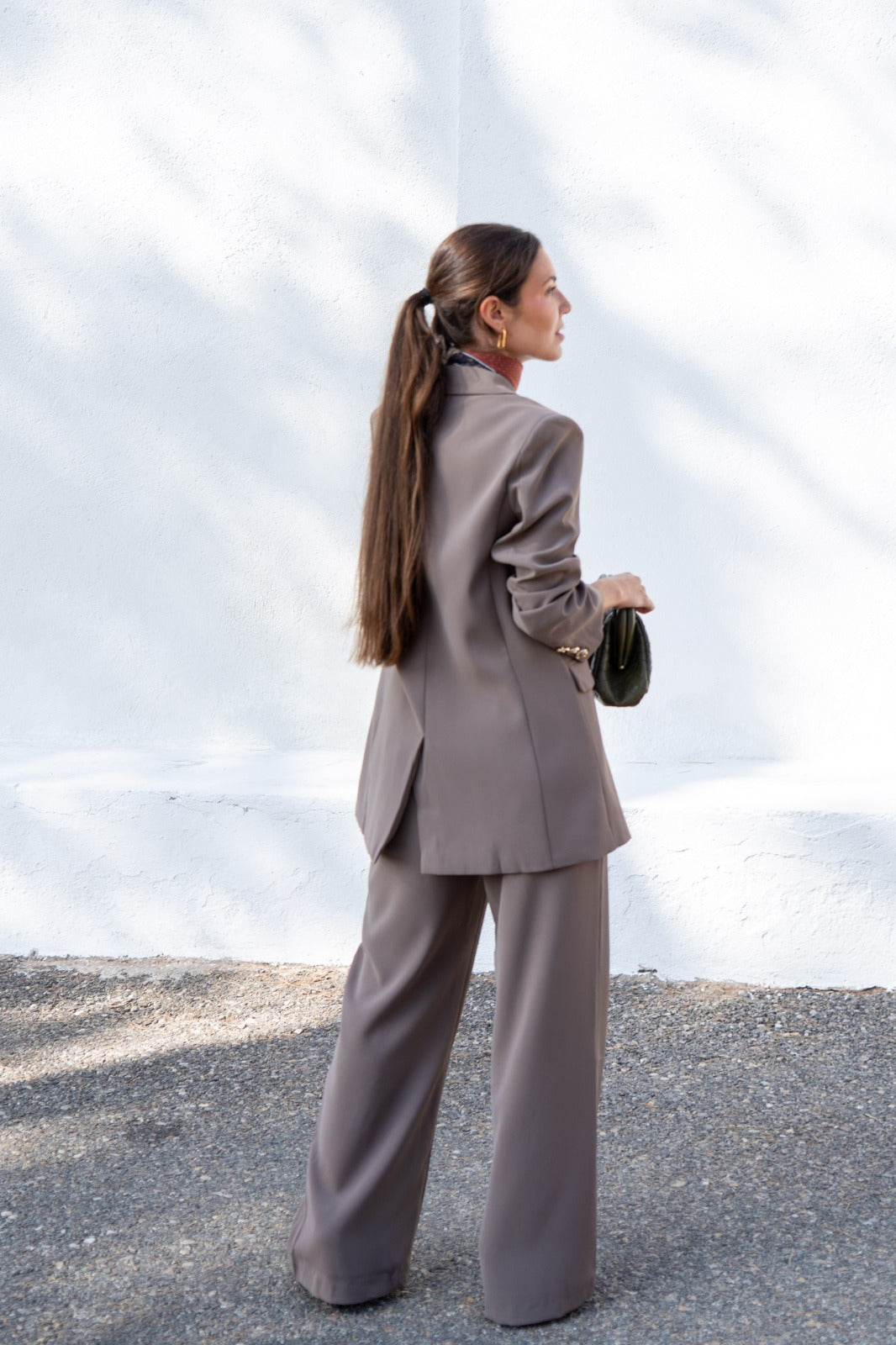 Conjunto compuesto por chaqueta, cuello solapa, bolsillos delanteros y pantalon ancho, bolsillos laterales. Tejido fluido en color verde.