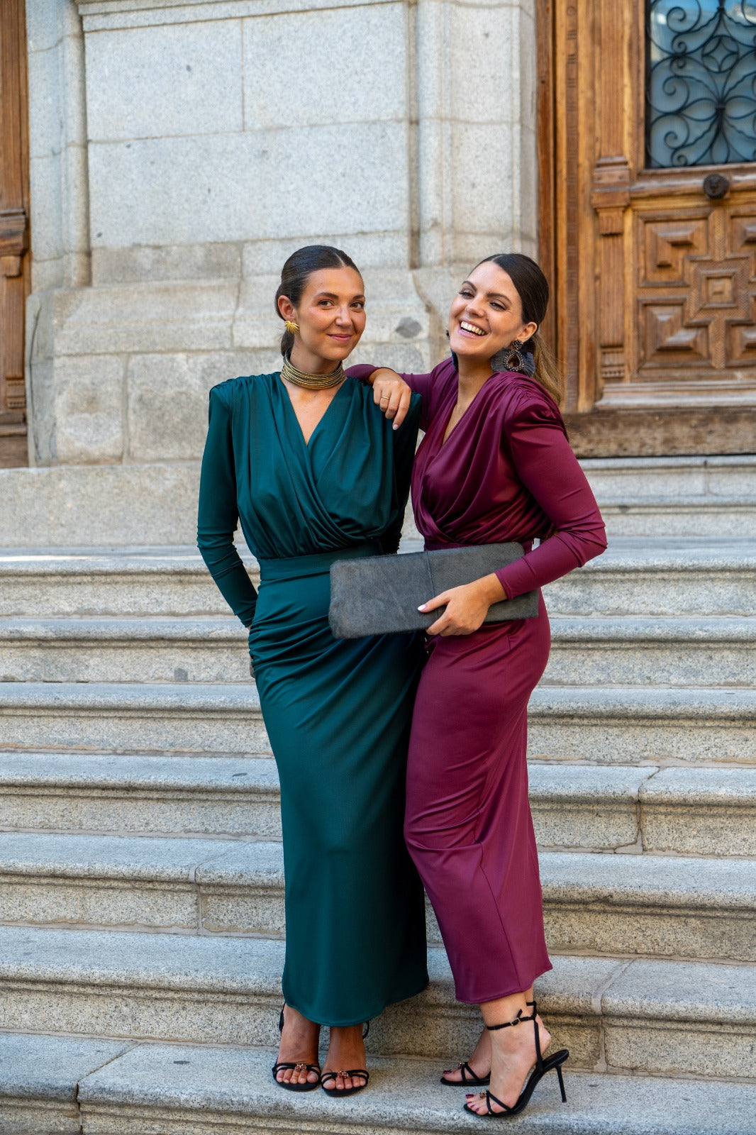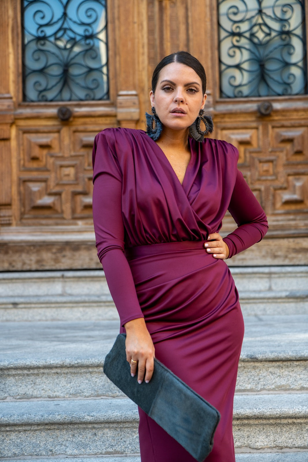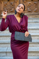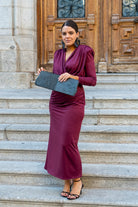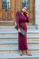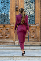 Conjunto compuesto por body escote cruzado, manga larga, hombros marcados y falda recta con cinturilla, drapeada. En color burdeos.