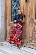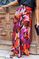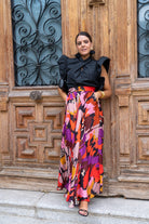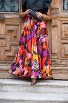 Falda larga, alta, tejido fluido, plisada, estampada en colores fuertes.