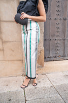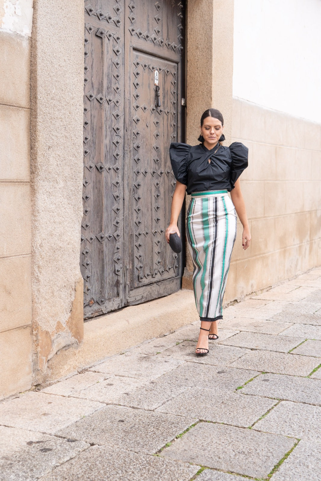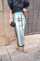 Falda midi, cintura lata, abertura delantera, detalle flecos negro en el bajo, En color estampada en rayas.