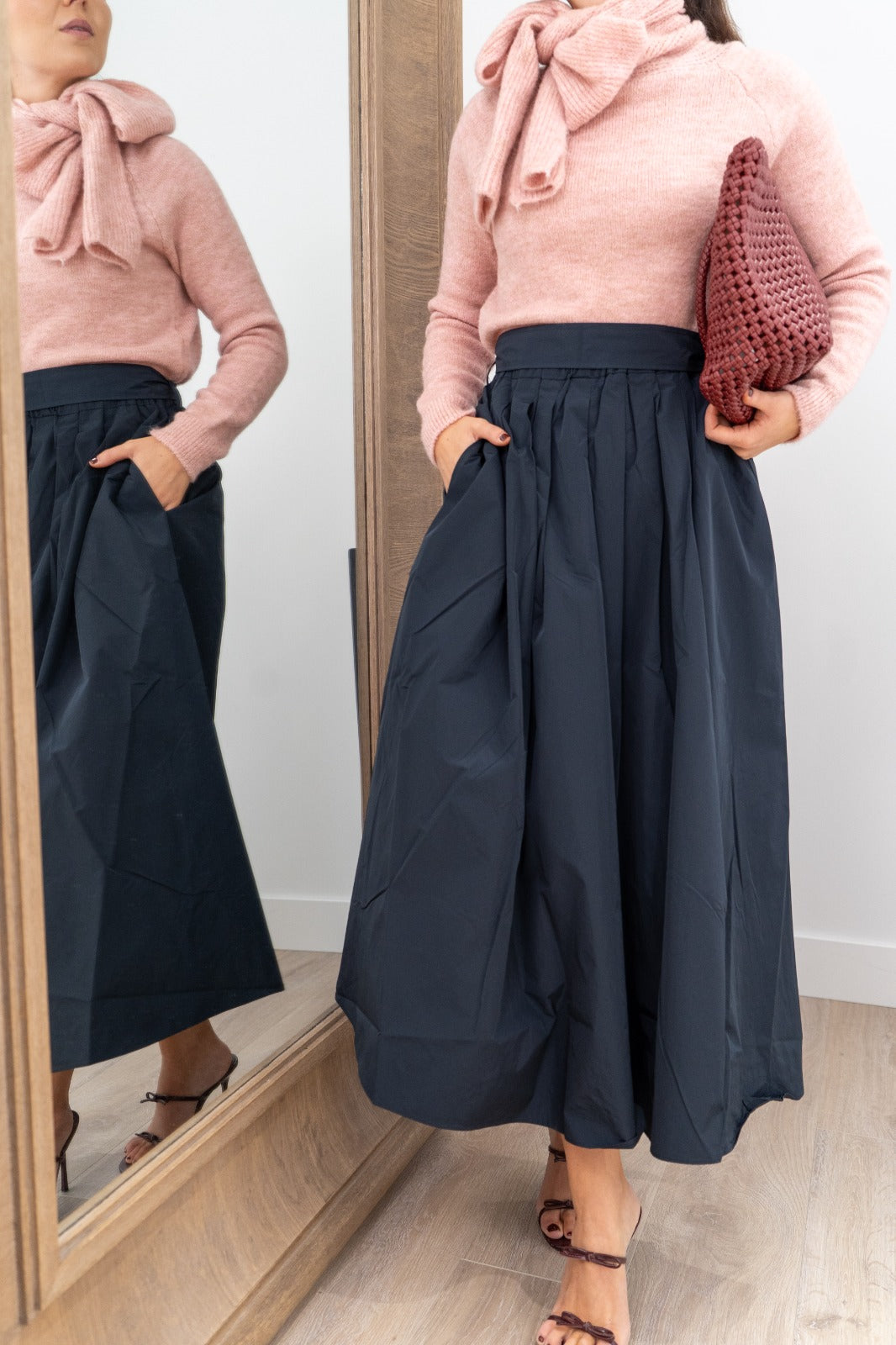Falda midi, cintura engomada, pinzas delanteras, bolsillos laterales. En tafetán azul.