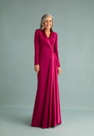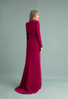 Vestido en triacetato con cuello esmoquin cruzado en brillo y manga larga. Corte en la cintura con falda cruzada y pequeños pliegues que deja ver la parte brillo del propio tejido. Cinturón en triacetato. En color buganvilla.
